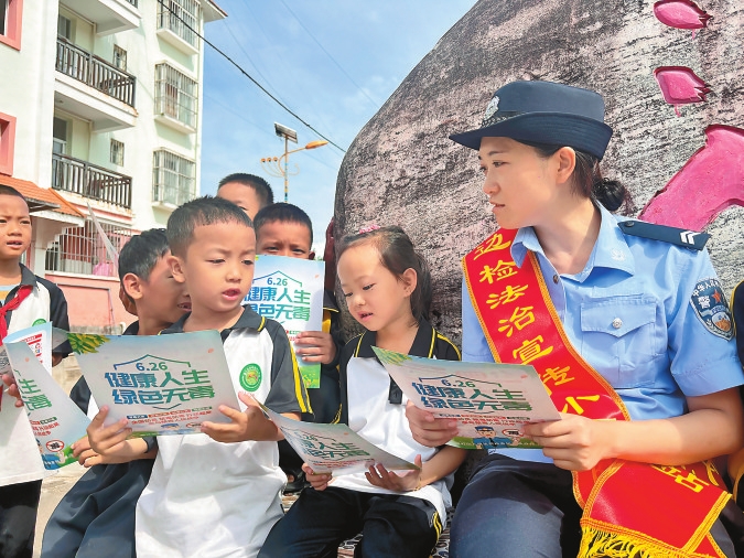 在第37个国际禁毒日来临之际,畹町边检站芒线分站组建宣传普法小分队,采用民警搭台、流动宣传、全民参与的形式,开展国际禁毒日普法宣传活动,把禁毒知识送进学校、企业、社区村寨,提高群众识毒、防毒、拒毒意识。