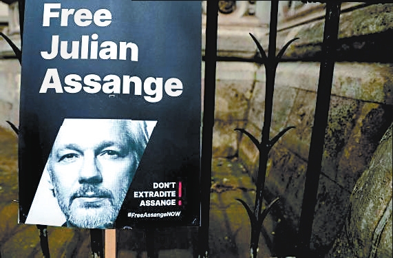 图为3月26日在英国高等法院外拍摄的写有“释放阿桑奇”的标语牌。