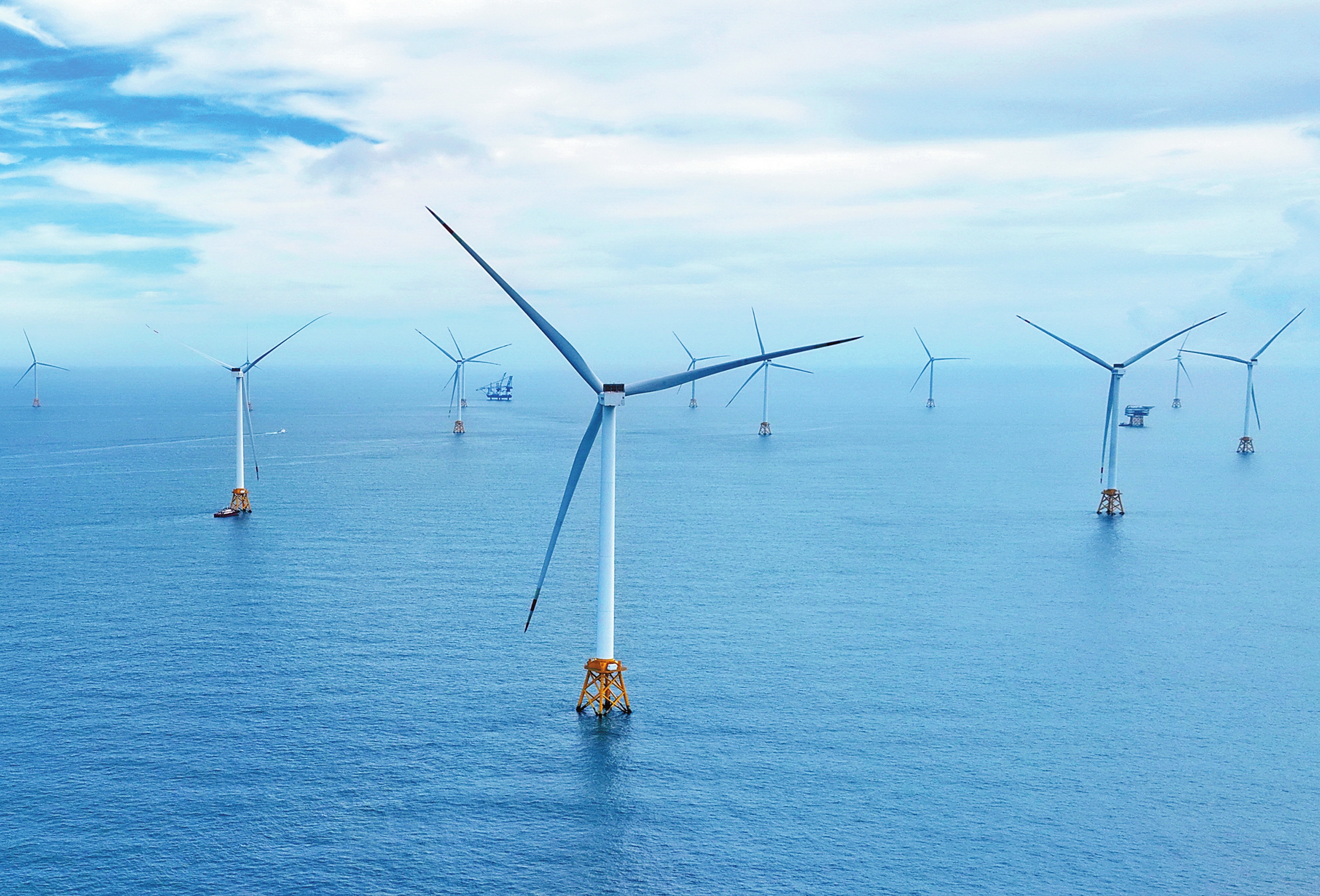 6月27日,全国首个超大单机容量的海上风电机组项目——三峡集团漳浦二期海上风电项目实现全容量并网发电。该项目位于福建省漳浦县海域,总装机容量达400兆瓦,是我国首个全部采用13兆瓦及以上超大单机容量风机的海上风电场,其中批量化应用了6台16兆瓦海上风电机组。项目投产后,预计每年可生产16亿度清洁电能,在满足68万户家庭年用电量的情况下,减排二氧化碳约136万吨。图为三峡集团漳浦二期海上风电项目现场。新华社记者 林善传 摄