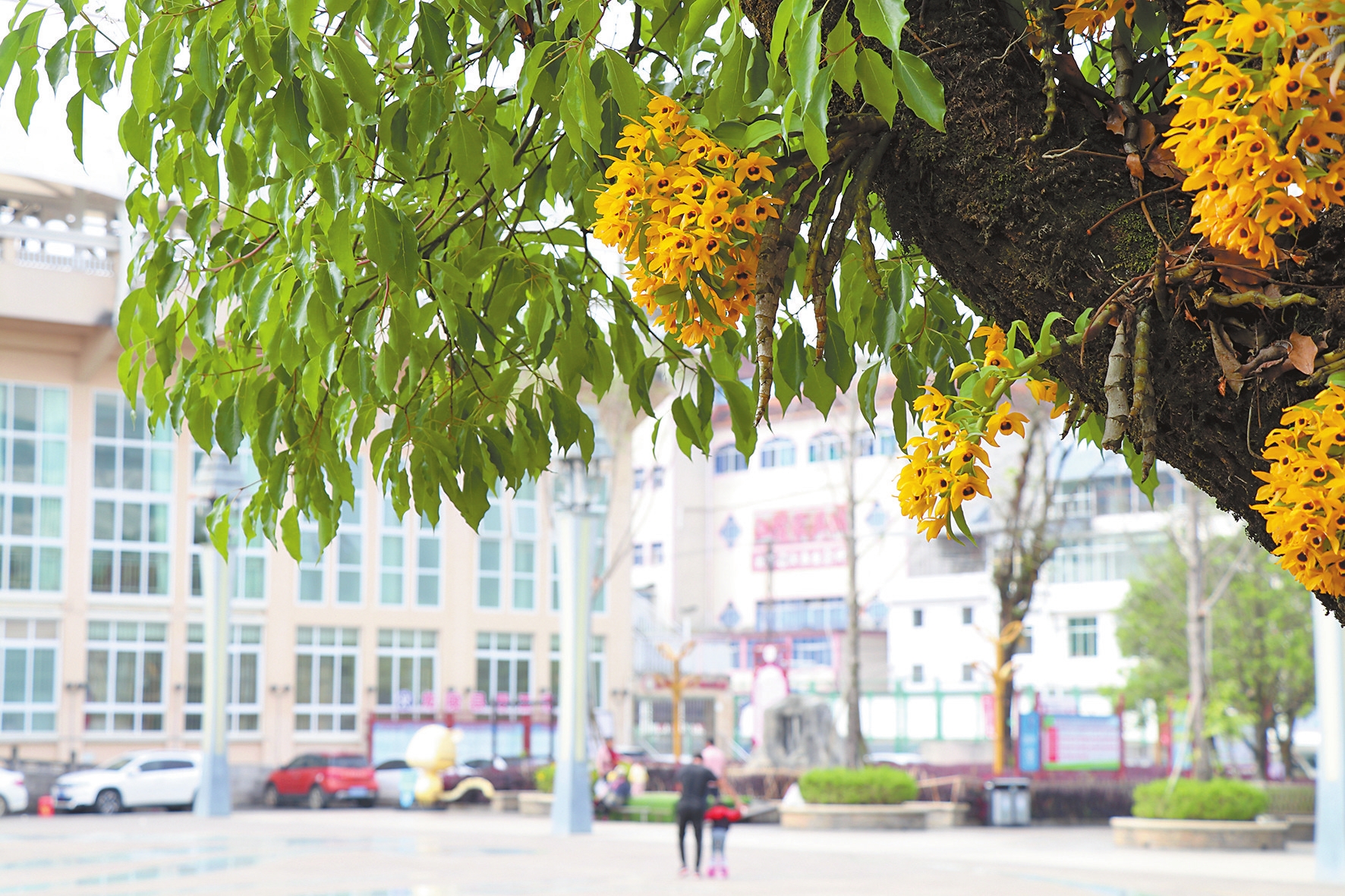 每年4至6月是石斛花盛开的季节。走进龙陵县城,只见各种各样的石斛花竞相绽放在绿油油的云南樟下,为绿美县城增彩添色。