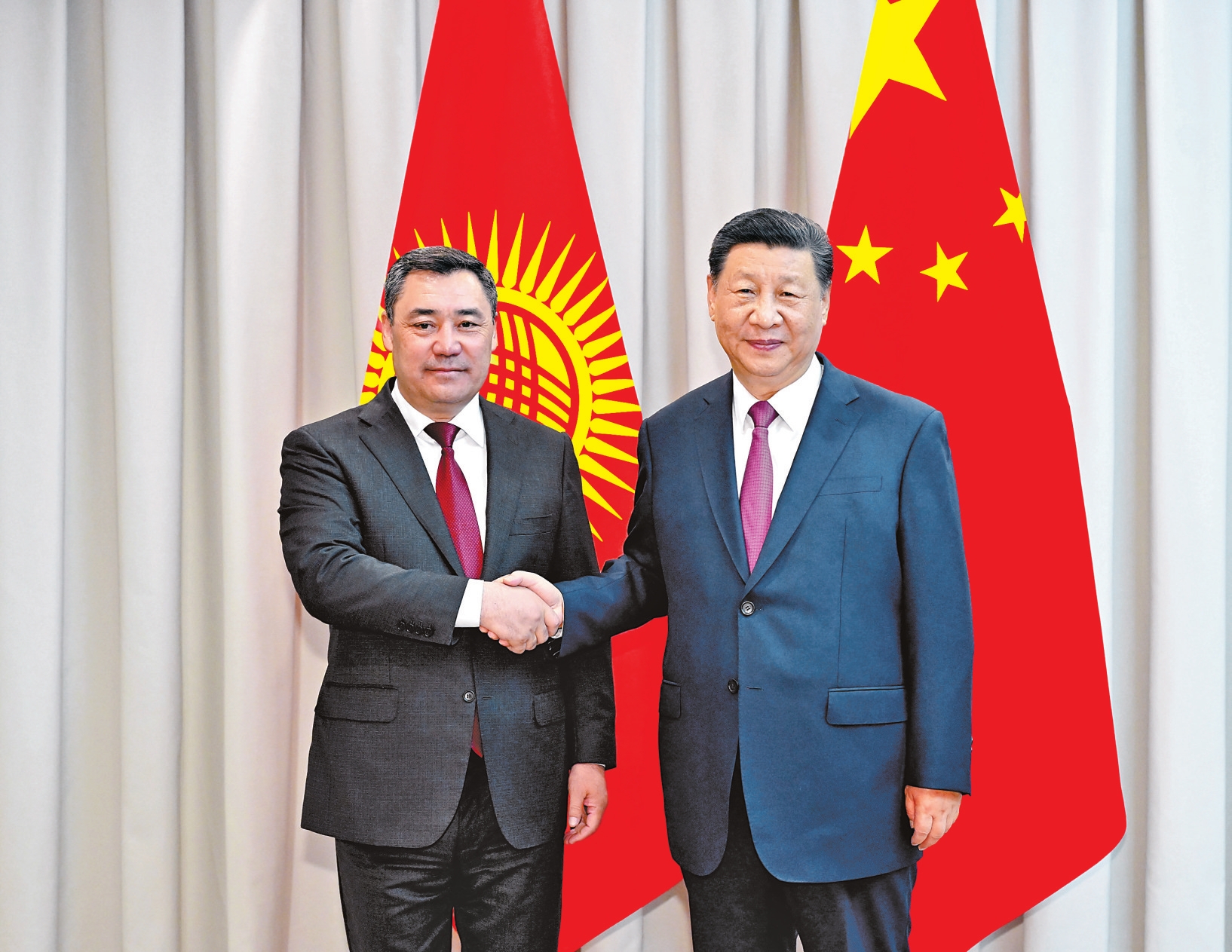 习近平指出,去年5月,我们在西安举行了富有成效的会谈,就中吉关系和两国各领域合作达成许多共识。一年多来,这些共识得到有效落实,中吉合作喜讯频传。亲望亲好,邻望邻好。中方乐见一个稳定发展的吉尔吉斯斯坦,将一如既往坚定支持吉方维护国家独立、主权和领土完整,坚定支持吉方走出一条符合本国国情的发展道路。中方愿同吉方深化发展战略对接,扩大治国理政经验交流,推动全方位互利合作,推进中吉命运共同体建设。