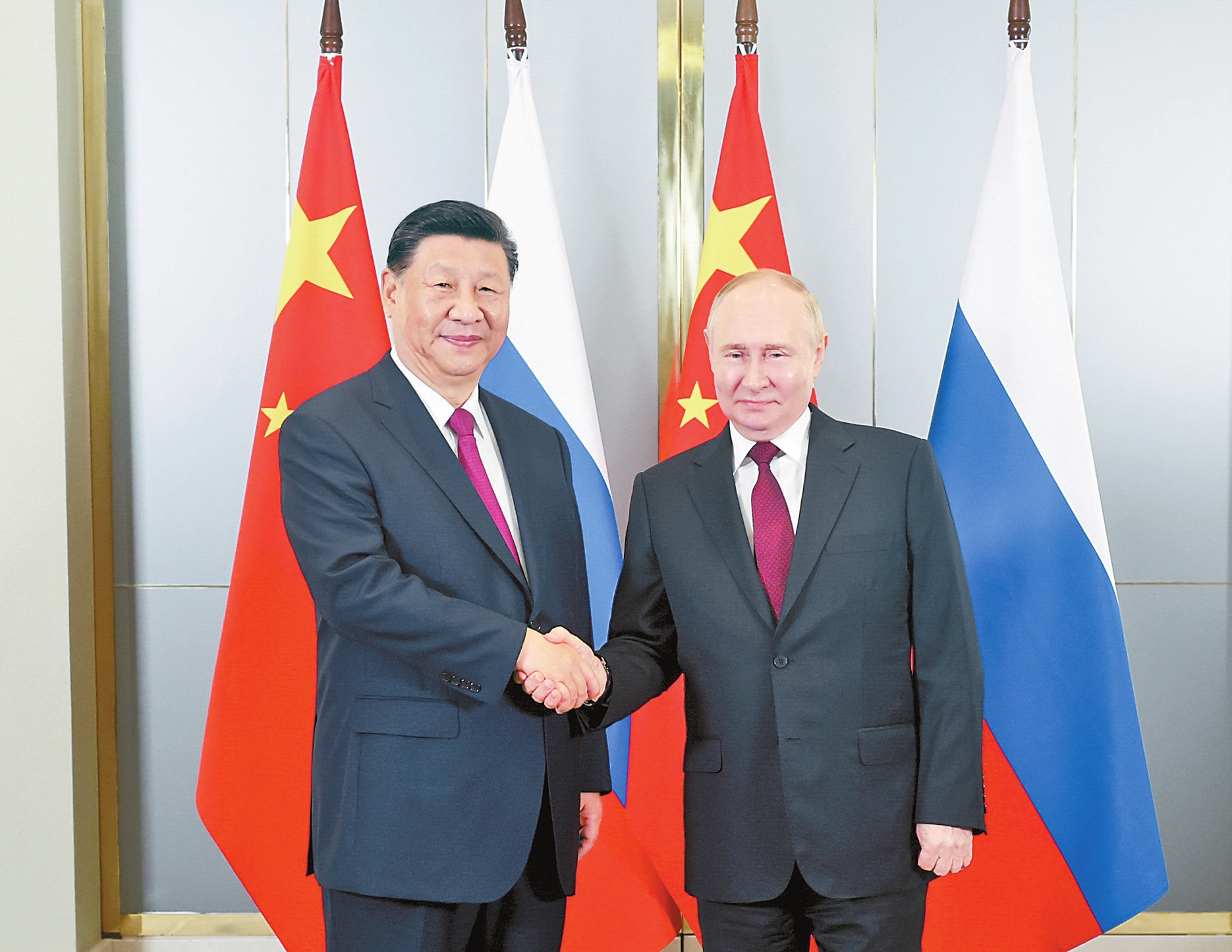 习近平强调,中俄要继续加强发展战略对接和国际战略协作。中方支持俄方履行好金砖国家轮值主席国职责,团结“全球南方”,防止“新冷战”,反对非法单边制裁和霸权主义。明天将举行上海合作组织阿斯塔纳峰会。中方期待同俄罗斯和各成员国一道,推动本组织发展行稳致远,打造更加紧密的上海合作组织命运共同体。中俄双方要继续加强全面战略协作,反对外部干涉,共同维护本地区安宁稳定。