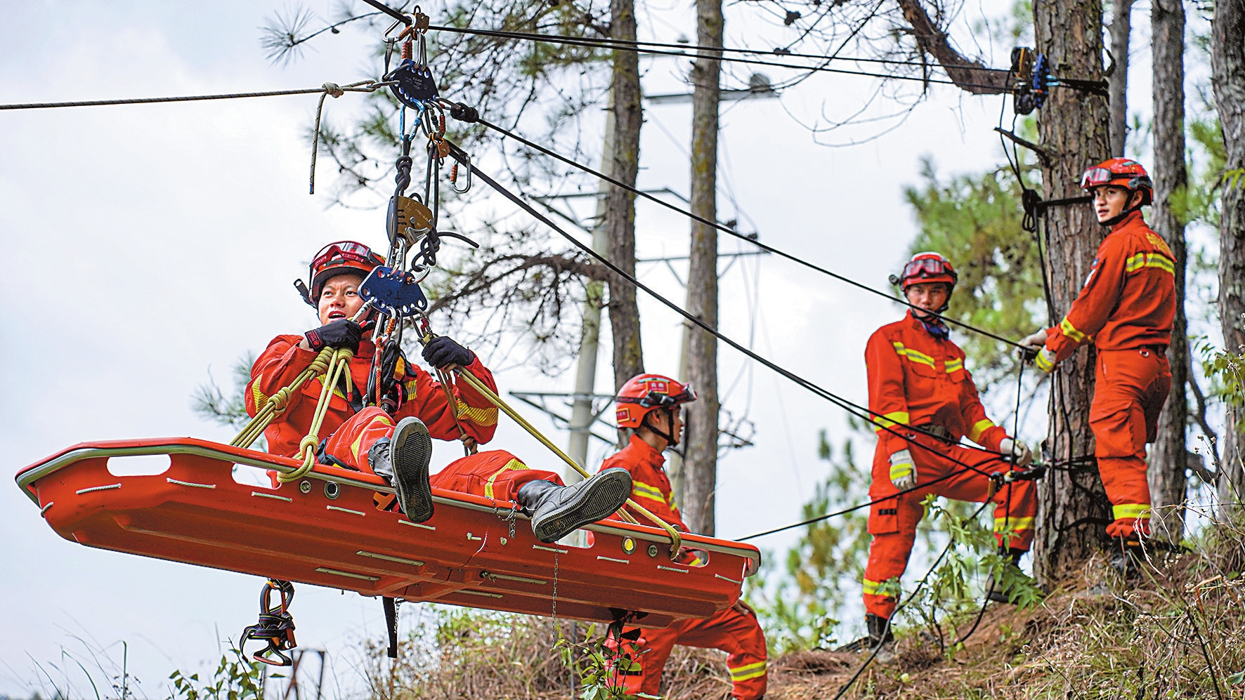 绳索救援主要运用在山岳、水域等事故救援当中,考验消防员对绳索、绳结、各类装备的使用能力以及在高空作业时克服恐高和应对各类突发情况的心理能力,这是磨炼指战员技能、体能、智能的一项综合性训练科目。