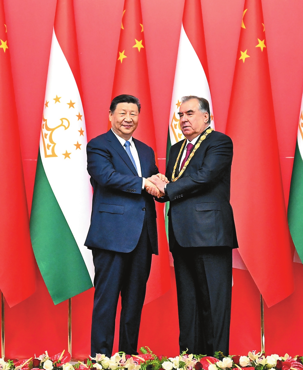 习近平指出,今天我们举行隆重仪式,向中国人民的老朋友——塔吉克斯坦总统拉赫蒙阁下颁授中华人民共和国对外最高荣誉勋章——“友谊勋章”。这是中国首次在境外颁授“友谊勋章”,是为表达中国人民对拉赫蒙总统和塔吉克斯坦人民友好感情作出的特殊安排。