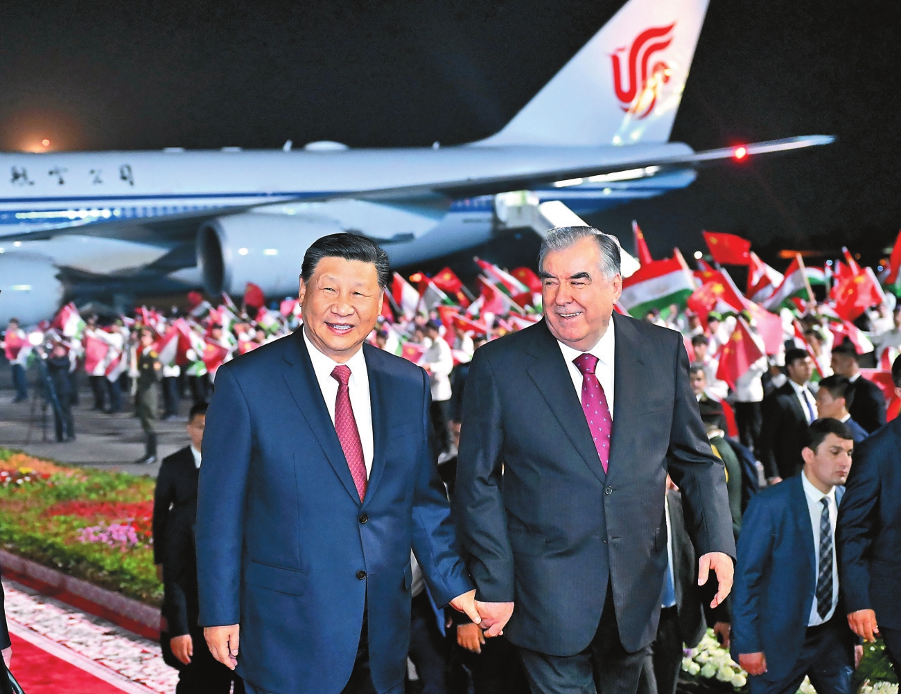 当地时间7月4日晚,国家主席习近平乘专机抵达杜尚别,应塔吉克斯坦共和国总统拉赫蒙邀请,对塔吉克斯坦进行国事访问。拉赫蒙在机场为习近平举行盛大隆重的迎宾仪式。新华社记者 燕雁 摄