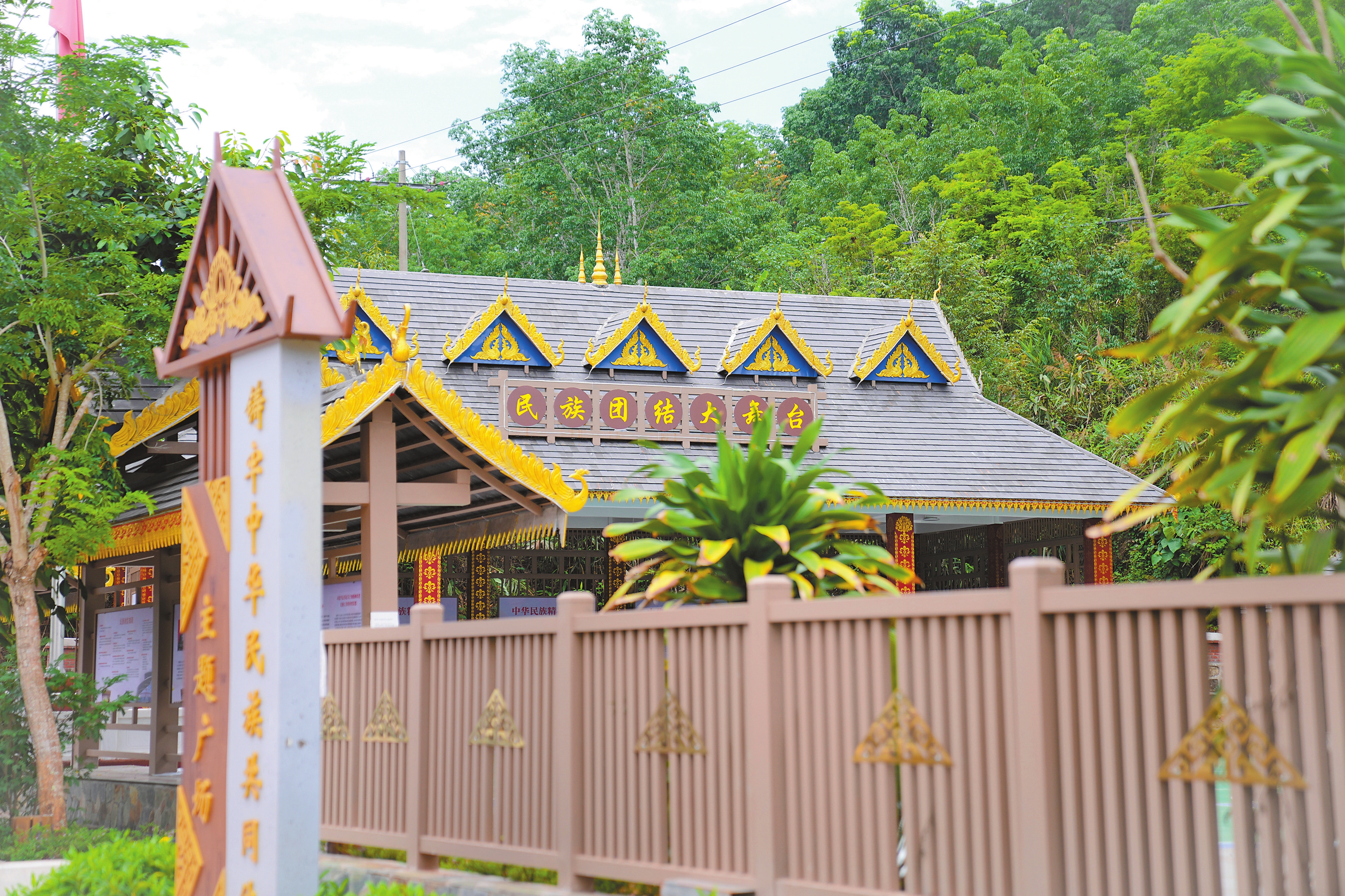 走进磨憨镇龙门村,穿过金碧辉煌、端正大气的傣式村寨大门,孔雀蓝琉璃瓦和孔雀造型瓦头的傣式吊脚楼映入眼帘,房前屋后各色鲜花竞相绽放,芒果、木瓜、柚子等果树穿插其间,别有韵味。