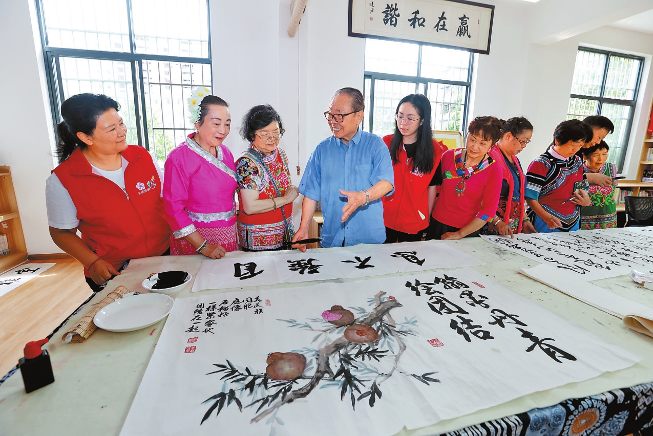 近日,昆明市金星社区充分发挥老党员的先锋带头作用,组织社区老党员、书画爱好者开展党建引领民族团结主题文化活动,用笔墨颂党恩,以诗词促团结,让中华民族共同体意识植根群众心中。本报记者 陈飞 通讯员 张轩鸣 摄