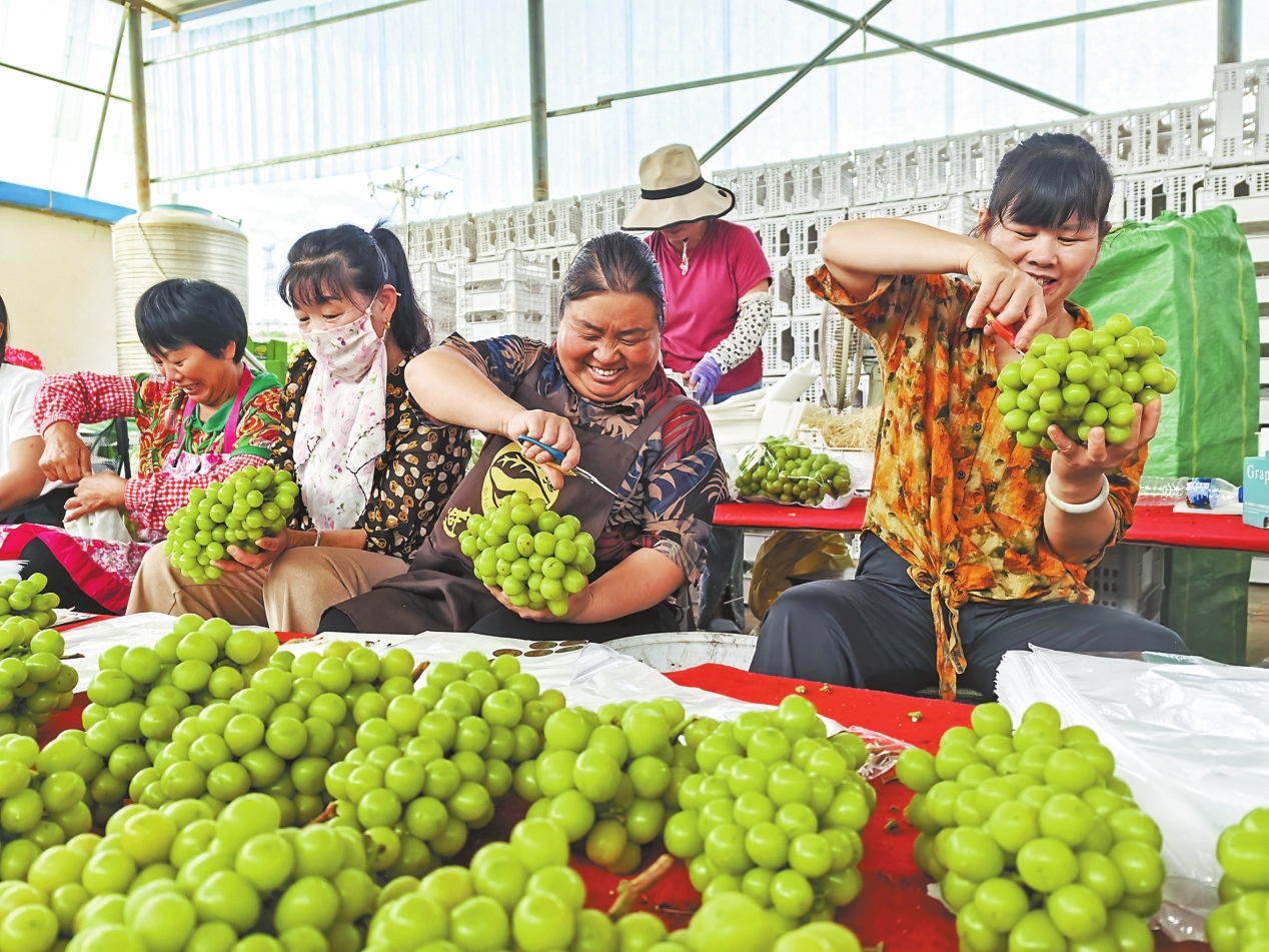在种植基地的打包台上,工人们熟练地挑拣刚采摘下来的葡萄,对葡萄进行修形、包装。随着葡萄的上市,每天有80多名工人在种植基地务工,每年带动当地群众就业300余人次。包装工人黄丽萍说:“每年葡萄成熟的时候,就会到这里做活,基地提供食宿,每天有130元工钱,大家都愿意到这里做工。”