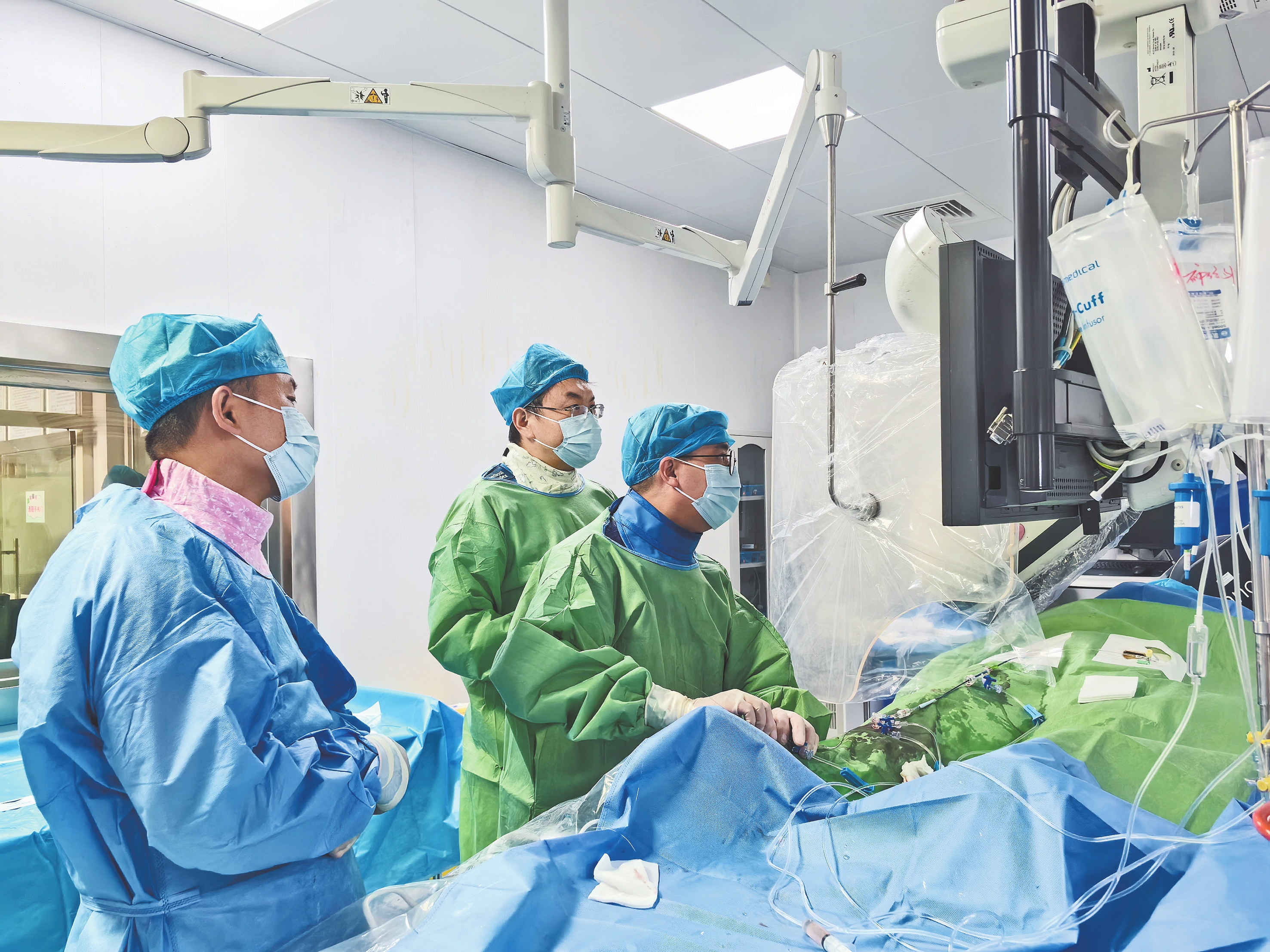 医共体总院急救中心确诊其为大脑中动脉闭塞、大脑动脉闭塞脑梗死,经医生判断患者属溶栓禁忌,但有介入手术指征,遂立即开展全身麻醉下行脑血管造影,经皮大脑中动脉球囊扩张成形术、经皮大脑中动脉支架置入术。术后第7天病情平稳后,患者由医共体总院下转到下庄中心卫生院持续进行康复治疗。