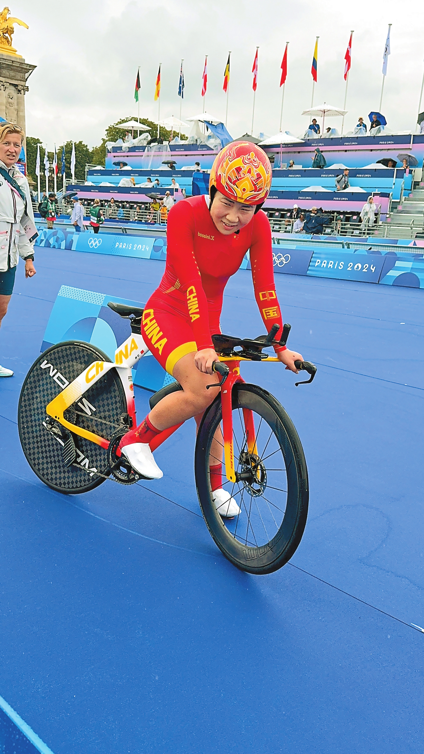 巴黎奥运会公路自行车个人计时赛男子、女子组均使用长度为32.4公里的赛道,累计爬升为150米,比赛的终点设在塞纳河上著名的亚历山大三世桥上,选手们在比赛中还会途经巴士底广场等巴黎著名地标。比赛当日,巴黎阴雨蒙蒙,街道湿滑,偶有积水,为公路自行车的比赛带来了一定难度。