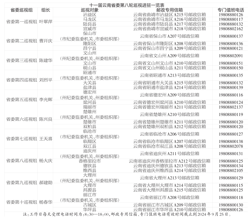 省委各巡视组将在有关被巡视地区工作2个月左右。巡视期间设专门值班电话、邮政专用信箱,主要受理反映被巡视党组织领导班子及其成员,下一级党组织主要负责人和重点岗位人员问题的来信来电来访,重点是违反政治纪律、组织纪律、廉洁纪律、群众纪律、工作纪律和生活纪律等方面问题反映。其他不属于巡视受理范围的信访问题,将按规定由被巡视地区和有关部门认真处理。省委巡视组受理信访时间截止到2024年9月25日。云巡轩