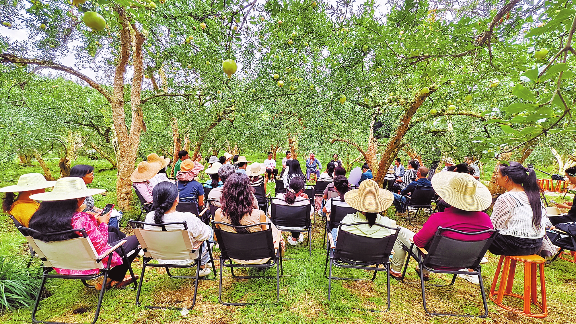 “修剪标准——左右不影响,上下不重叠,枝枝照光,果果向阳;修剪技法——撑、拉、吊、剪、扭、揉、环剥。”夏日的新安所百年古树石榴园内,助农文明实践小分队队员、蒙自石榴栽培技术发起人高光明正在传授自己精心提炼的石榴修剪26字真言。