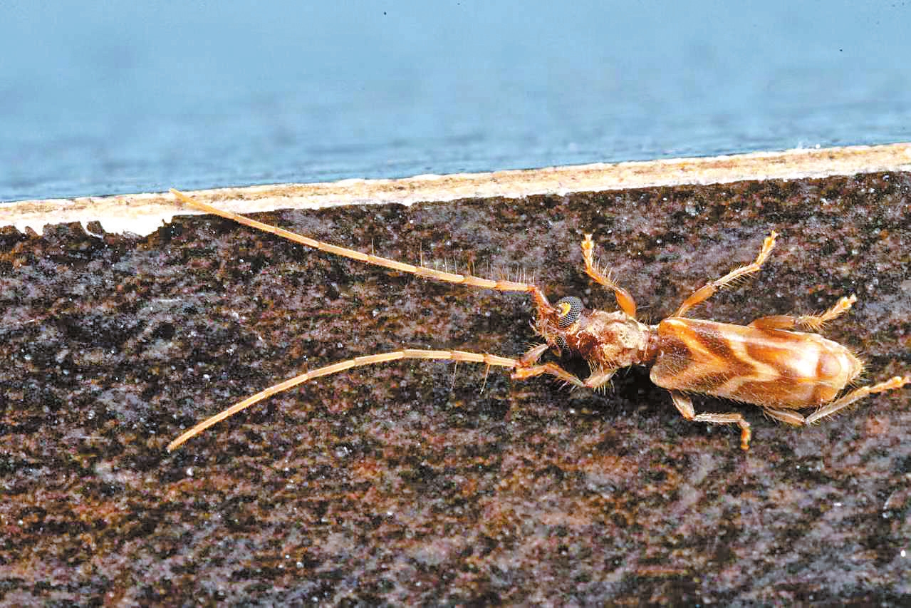 本报讯(记者 李建伟) 近日,生态摄影师赵益在昆明市西山区一小区花园拍到一只奇特的昆虫,昆虫身体为栗褐色,拥有巨大的复眼和显著的触角,经天牛分类专家鉴定为台湾狭天牛。