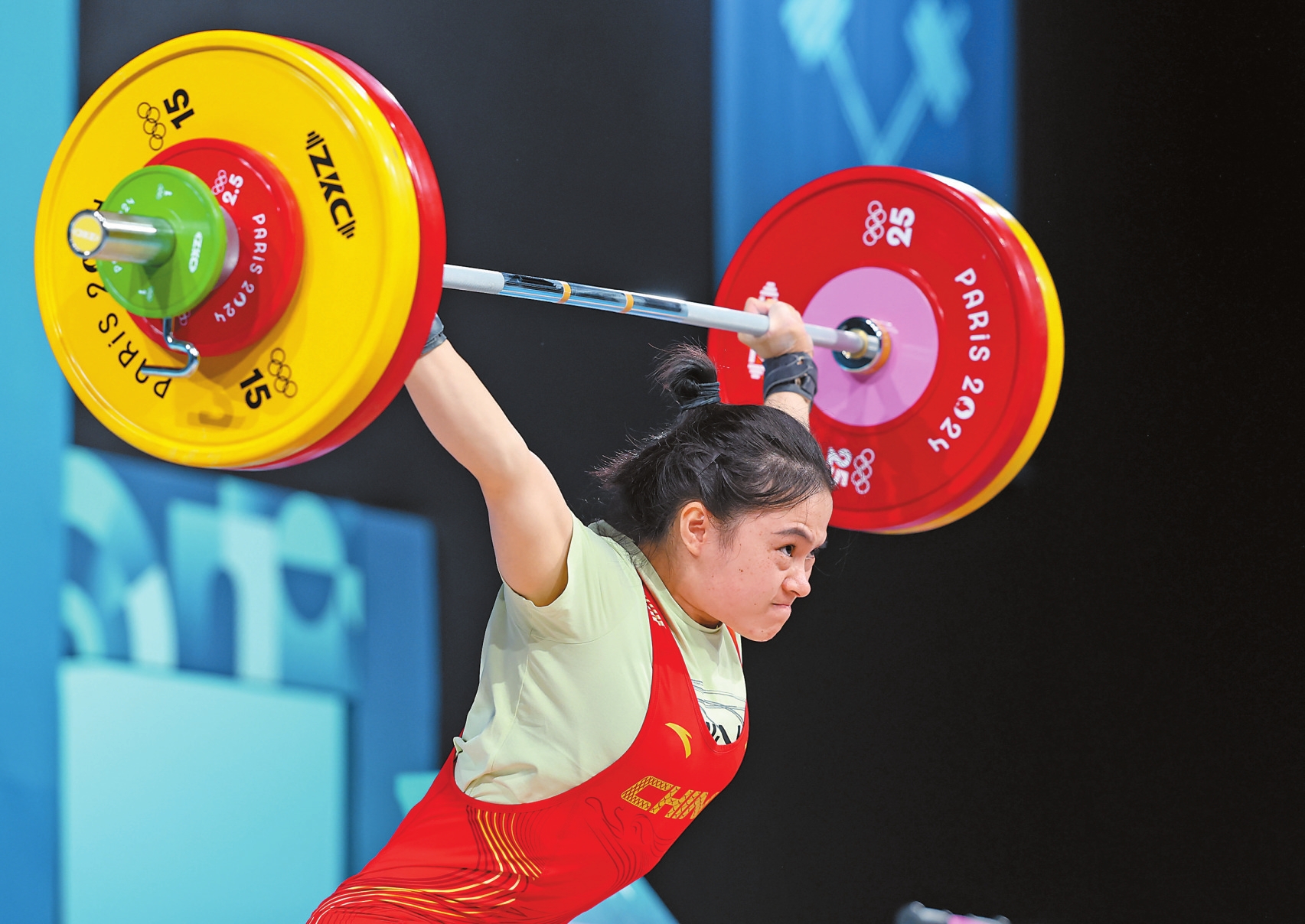 106公斤,查伦试举成功,刷新奥运纪录。随后罗诗芳上台,也是当日抓举的全场最后一举。下蹲,慢慢起,罗诗芳将107公斤稳稳举过头顶,定格新的抓举奥运会纪录。
