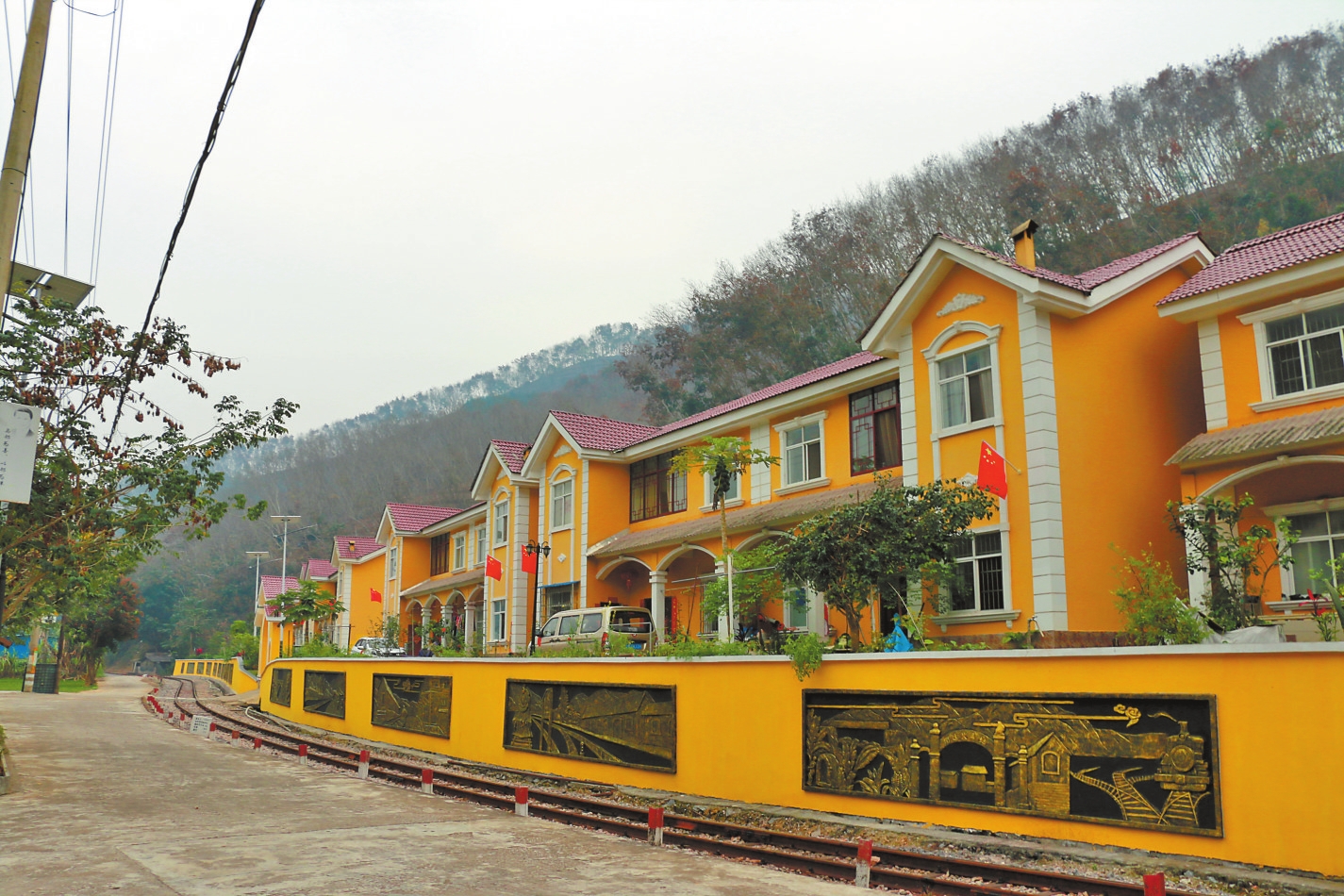 沿铁路向村寨走去,自然风光尽收眼底,一幢幢明黄色的法式小洋楼依山而建,山上则是漫山遍野的橡胶林。