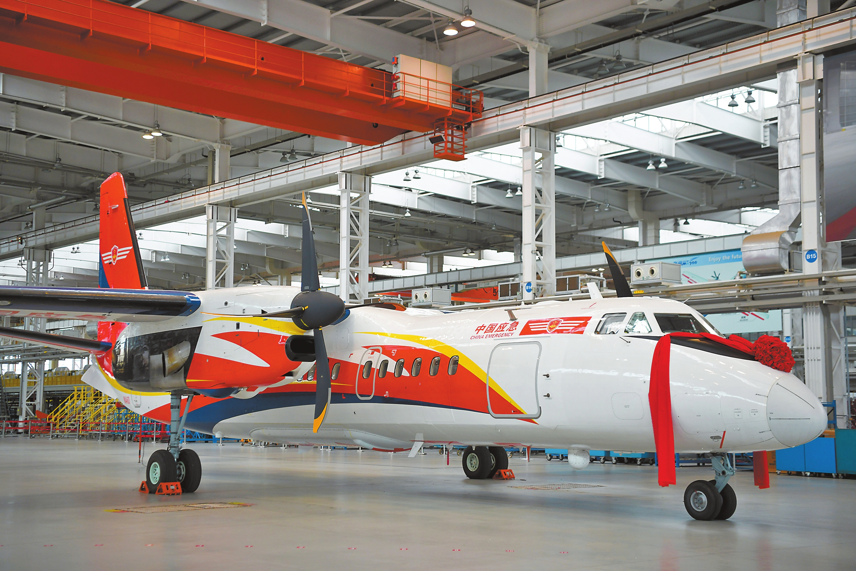 “新舟”60灭火飞机是一款具有自主知识产权的大中型固定翼应急救援飞机,最大载水量6吨,最大人员运输数量28人,最大货物运输重量3.7吨。飞机集投水灭火、火情监测、通信指挥、人员运输、物资运输等多功能于一体,具备快速响应、复杂地形作业等优势。图为8月26日正式交付的“新舟”60灭火飞机。 新华社记者 张博文 摄