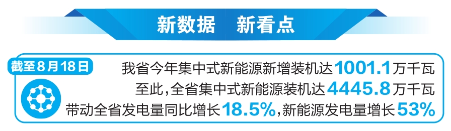 本报讯(记者 段晓瑞) 记者从南方电网云南电网公司获悉,截至8月18日,我省今年集中式新能源新增装机突破千万千瓦大关,达到1001.1万千瓦,至此,全省集中式新能源装机达4445.8万千瓦,带动全省发电量同比增长18.5%,新能源发电量增长53%,增速均居全国第一。