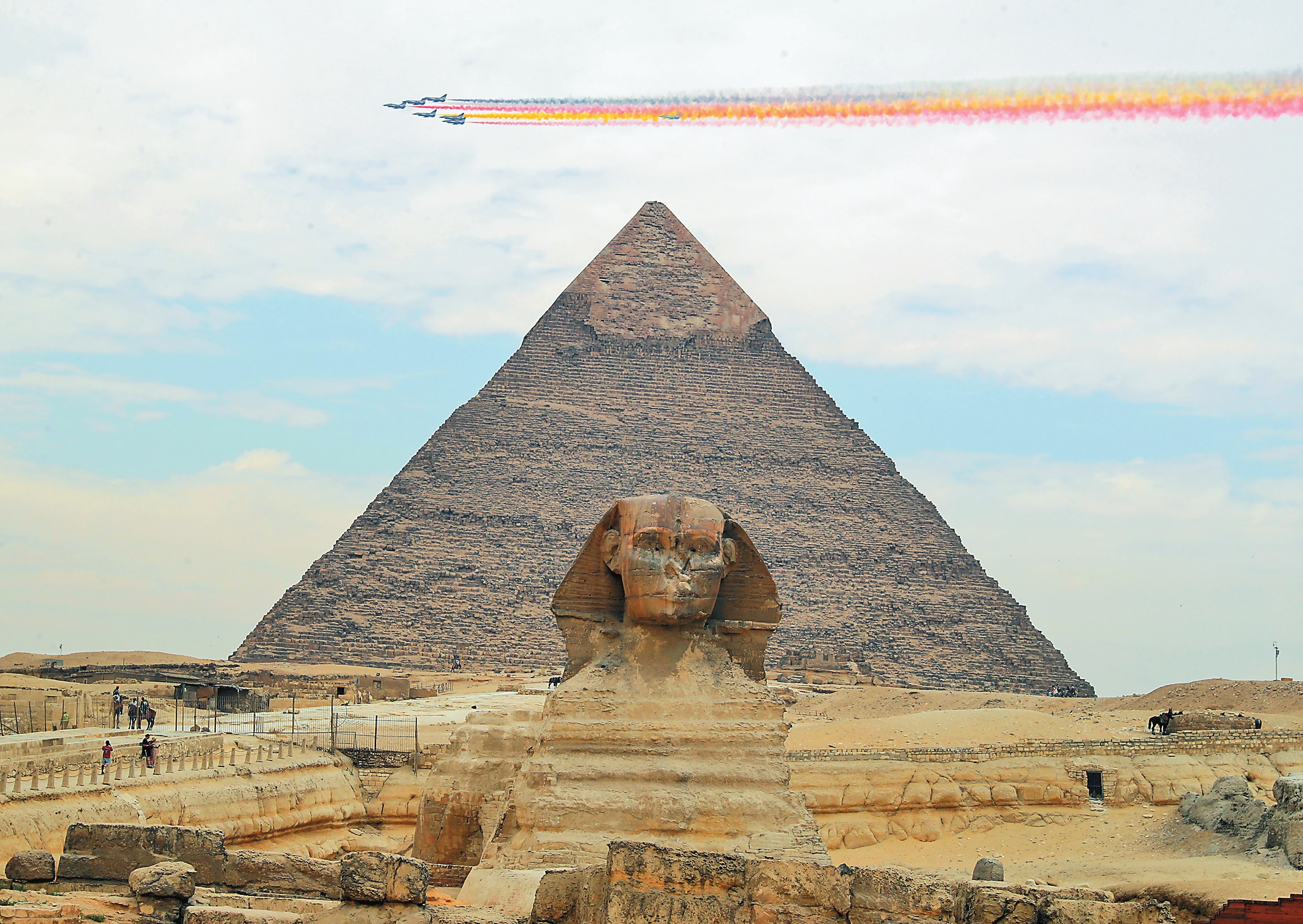 图为8月28日,在埃及吉萨金字塔景区,中国空军八一飞行表演队歼-10表演机编队飞越金字塔上空。