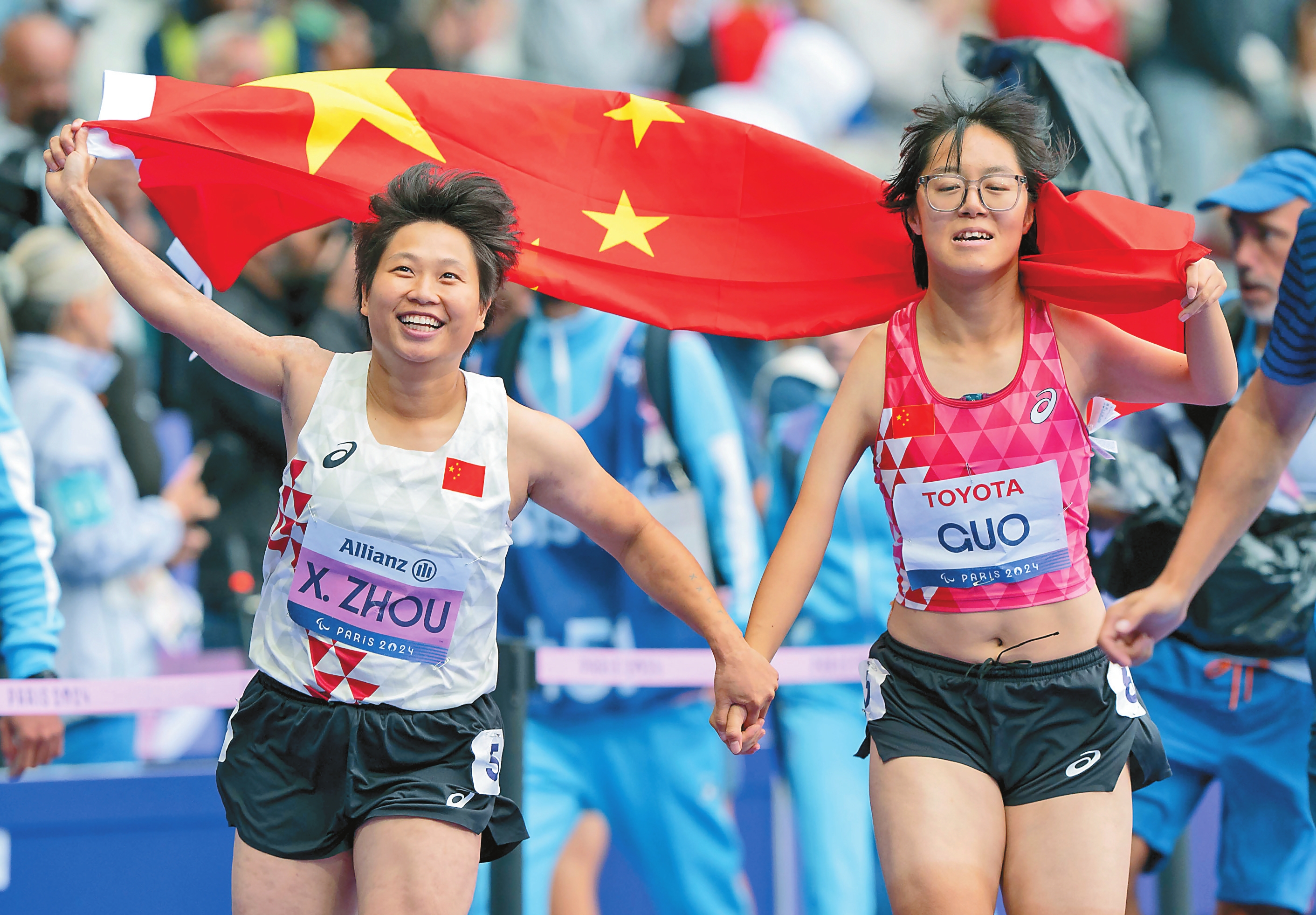 8月30日,在巴黎残奥会田径女子100米T35级决赛中,中国选手周霞以13秒58的成绩夺得金牌,中国选手郭芊芊以13秒74的成绩获得银牌。图为当日,冠军中国选手周霞(左)、亚军中国选手郭芊芊在比赛后庆祝。新华社记者 才扬 摄
