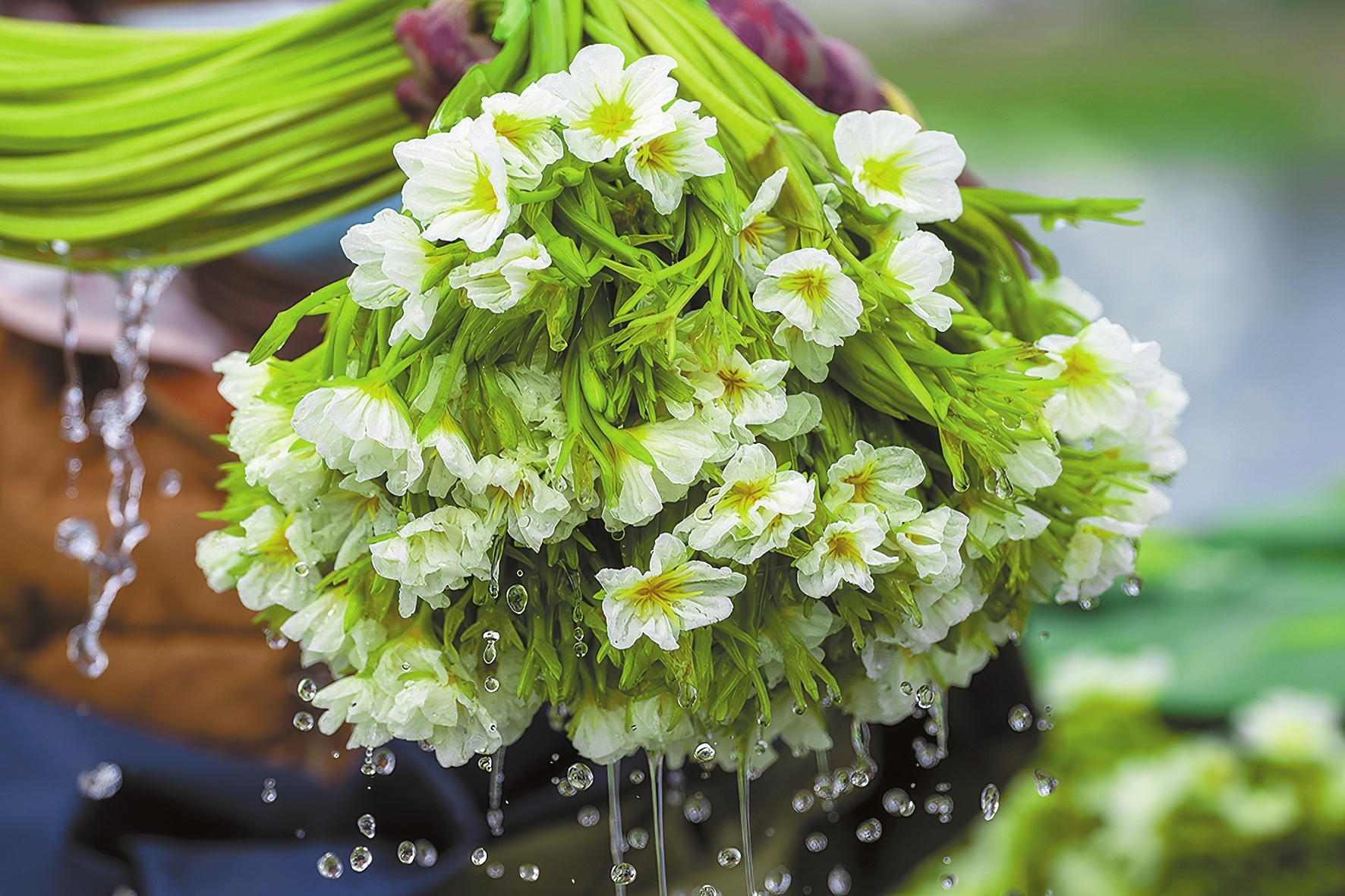 海菜的茎叶翠绿,如细绳索状,细长而脆软滑嫩,一般长约40至80公分,茎长随水深浅各异,最长可达4米。茎顶开花,有苞,每开花四五朵,花期一般为每年5—10月,温暖地区可全年有花。海菜富含维生素、微量元素和矿物质,茎、花、嫩叶都可食用,有清热消肿等功效。白族民歌中常隐喻四处漂泊的人生“大理海子无根草,不飘不落不生根”,指的就是海菜。其实,海菜在洱海水面生长、漂浮,并非无根之物,而是根扎于土中,茎叶随波摇曳飘荡,花朵露出水面吐露芳华,宛如水中精灵绽放。洁白的花瓣喜欢聚集在一起,盛开绽放之时,整条溪河沟渠、整个池塘湖泊都开满了雪花般洁白的花朵,风姿摇曳,十分浪漫。