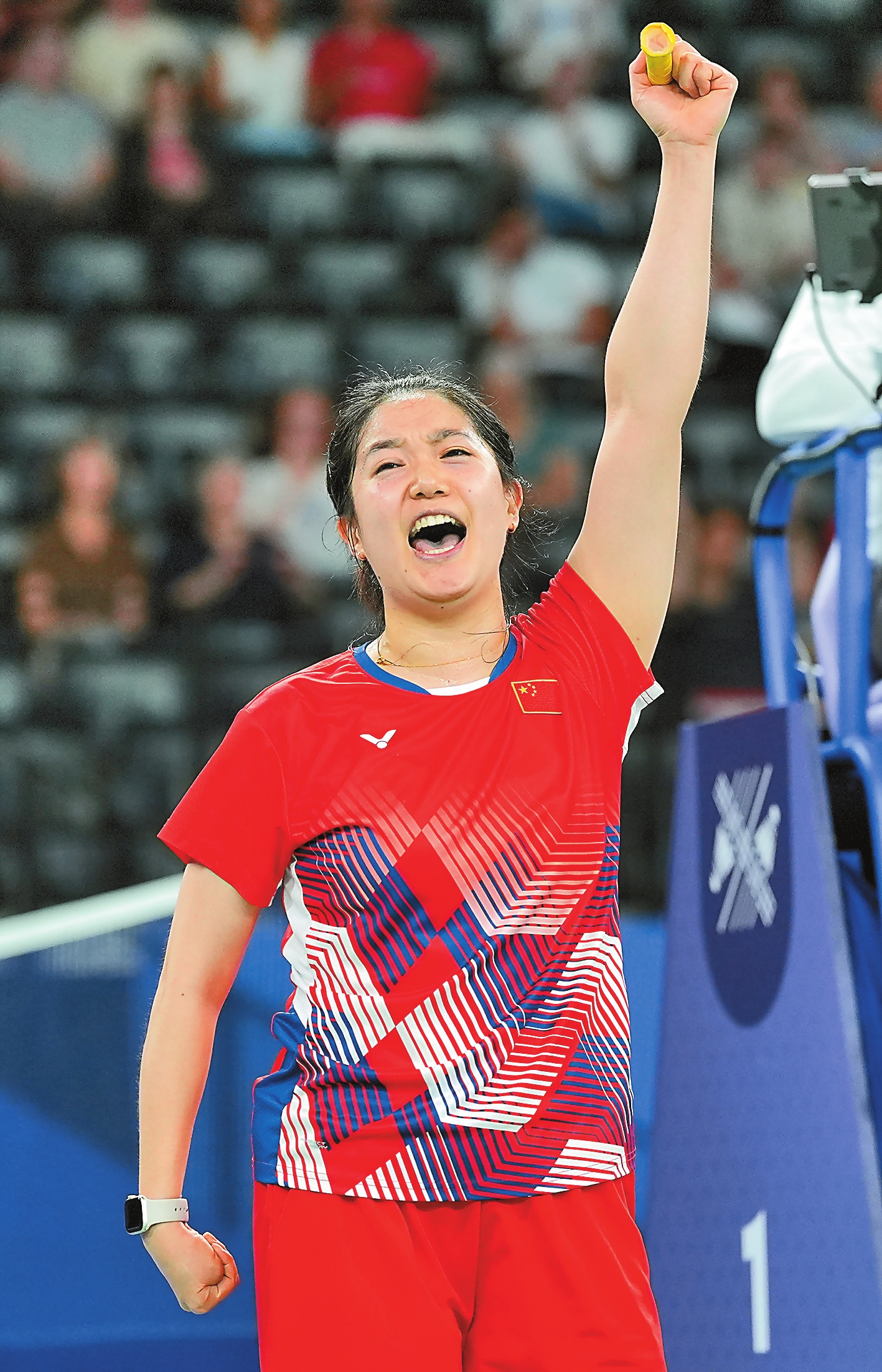 9月2日,在巴黎残奥会羽毛球女子单打SL3级决赛中,中国选手肖祖贤2比0战胜印度尼西亚选手沙库尔奥,夺得冠军。图为当日,肖祖贤庆祝胜利。 新华社记者 邢广利 摄