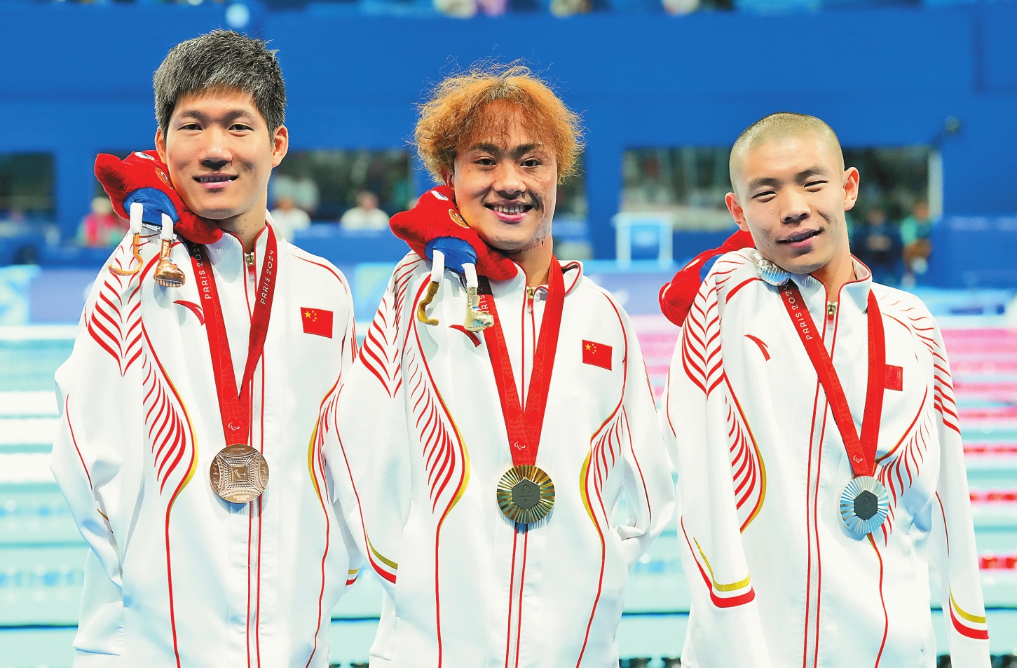 在巴黎残奥会游泳男子50米仰泳S5级决赛中,中国选手袁伟译、郭金城、王李超包揽冠亚季军。图为袁伟译(中)、郭金城(右)和王李超展示奖牌。新华社记者 高静 摄