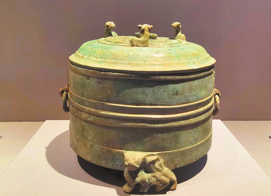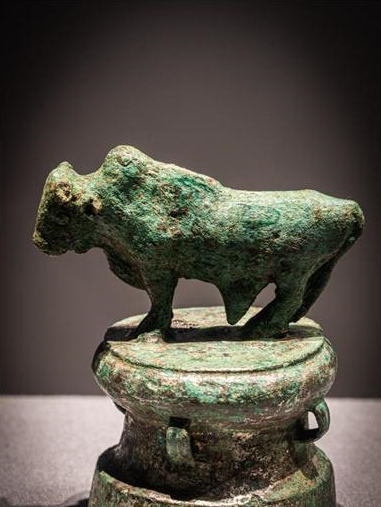 博物馆里珍藏的宝贝精美独特、意义深远,各种器物处处反映着古滇人的生活场景和风俗信仰。在古滇国,牛不仅是农耕社会的重要劳动力,更是财富、地位和精神信仰的象征,牛的形象被广泛运用在青铜器上。青铜鼓形牛杖首是晋宁石寨山墓地出土的杖头铜饰之一,其上端为立体的牛雕铸,下端为铜鼓形器座,座下为圆銎,銎内多残留有木杖遗迹,銎两侧有穿孔,横穿铜钉以固定木杖。还有四牛鎏金骑士贮贝器、青铜牛头饰等,造型栩栩如生。出土于晋宁金砂山墓地的青铜奁和陶屋模型,年代均为东汉时期。奁,是中原地区的典型器物,用于盛放梳妆用品或食物,以漆木质居多,也有陶质的,铜质的较为罕见,云南曾出土过铜奁,为数甚少,可视为外来输入品;陶屋模型,则体现了中原汉人南迁,滇国房屋建筑逐渐褪去“干栏式建筑”的色彩,融入了中原地区的建筑风格。