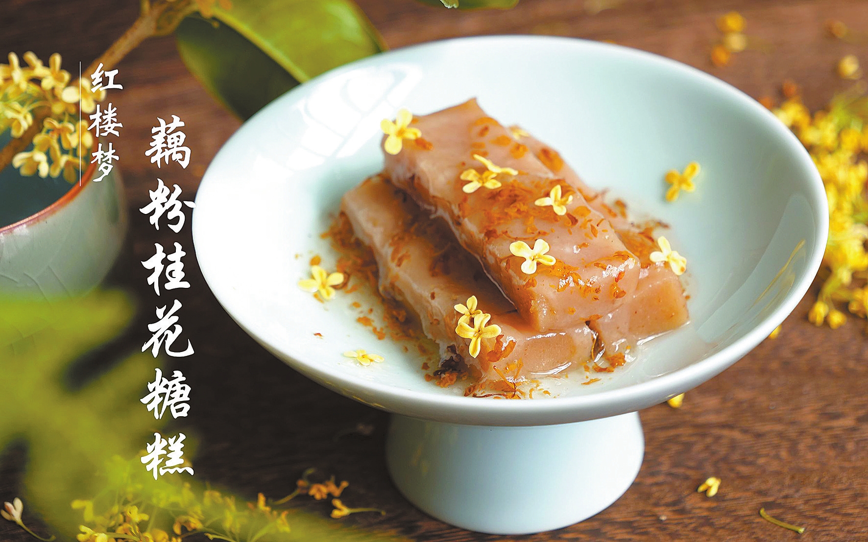 又到了秋高气爽、丹桂飘香的时节,街头暗香浮动、沁人心脾,不由得想起一道和桂花有关的吃食——藕粉桂花糖糕。很多人不知道的是,这道传统的江南美食在文艺作品《红楼梦》中也出现过。《红楼梦》第四十一回中,贾母带着宝玉、湘云、宝钗、黛玉及刘姥姥等人于大观园缀锦楼中吃过了酒,在山前树下游玩散闷,有丫鬟来请用点心,只见其“抬了两张几来,又端了两个小捧盒,揭开看时,每个盒内两样:这盒内一样是藕粉桂糖糕,一样是松穰鹅油卷……”有人说,曹雪芹笔下的贾府后厨是擅用本地食材且追求食之本味的,此言非虚,藕粉和桂花都是江南特产,厨师将二者作了巧妙搭配,既用桂糖凸显了藕粉的纯净细腻,又以藕粉衬托了桂糖的甘甜淡雅。可以想象,那些精致的糕点刚刚蒸制好,被丫鬟们装在捧盒里端上来时,有多么地软糯可口、芳香扑鼻。