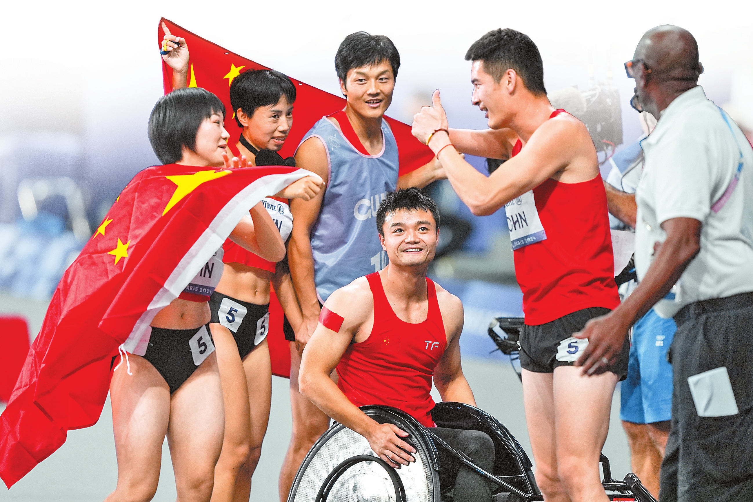 9月6日,在巴黎残奥会田径项目4X100米混合接力决赛中,由周国华、王浩、文晓燕和胡洋组成的中国队以45秒07的成绩夺冠,并打破该项目世界纪录。图为中国队选手王浩(右二)在赛后为队友点赞。 新华社记者 彭子洋 摄