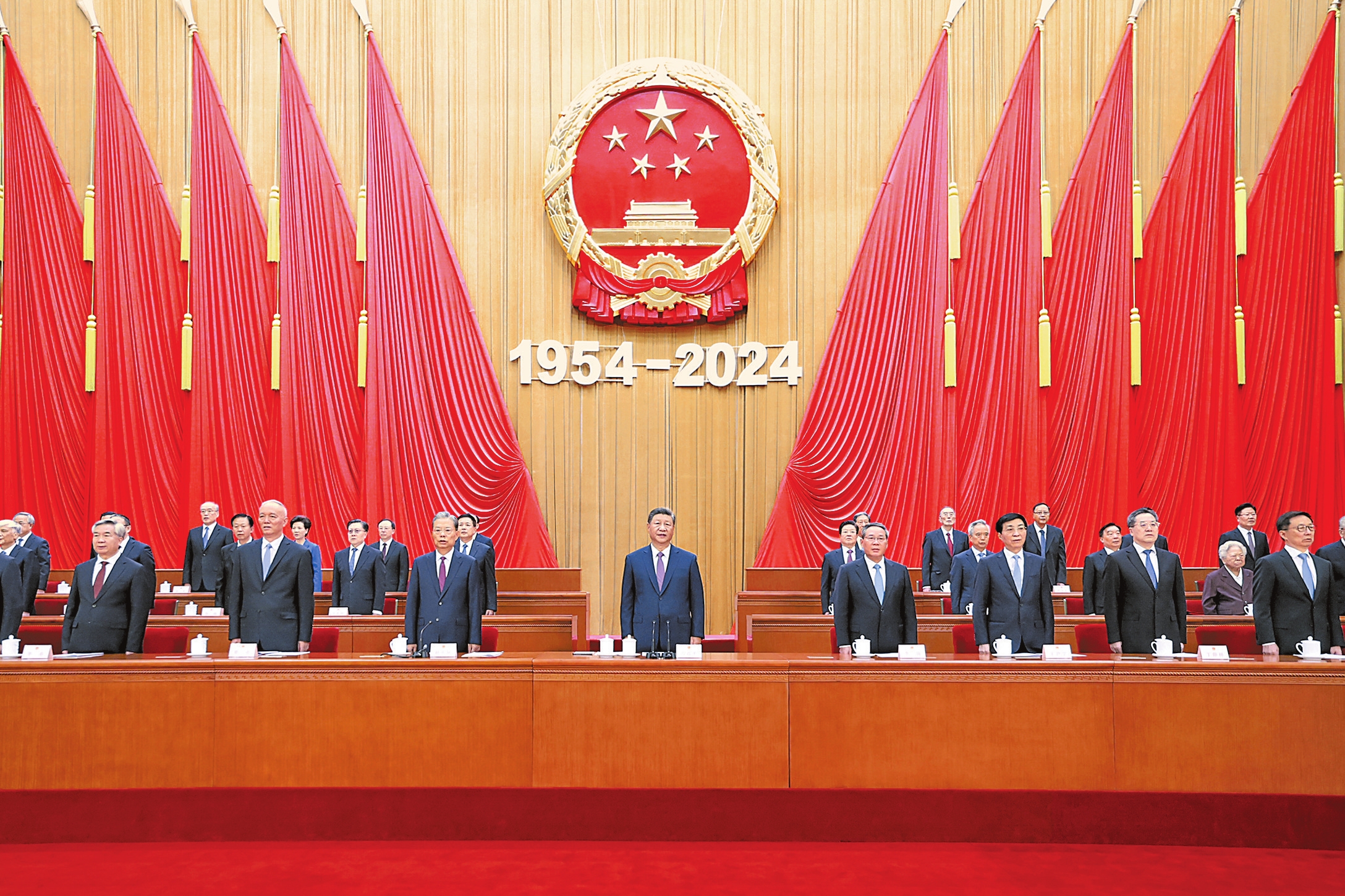 9月14日上午,中共中央、全国人大常委会在北京人民大会堂隆重举行庆祝全国人民代表大会成立70周年大会。习近平、李强、赵乐际、王沪宁、蔡奇、丁薛祥、李希、韩正等出席大会。 新华社记者 鞠鹏 摄