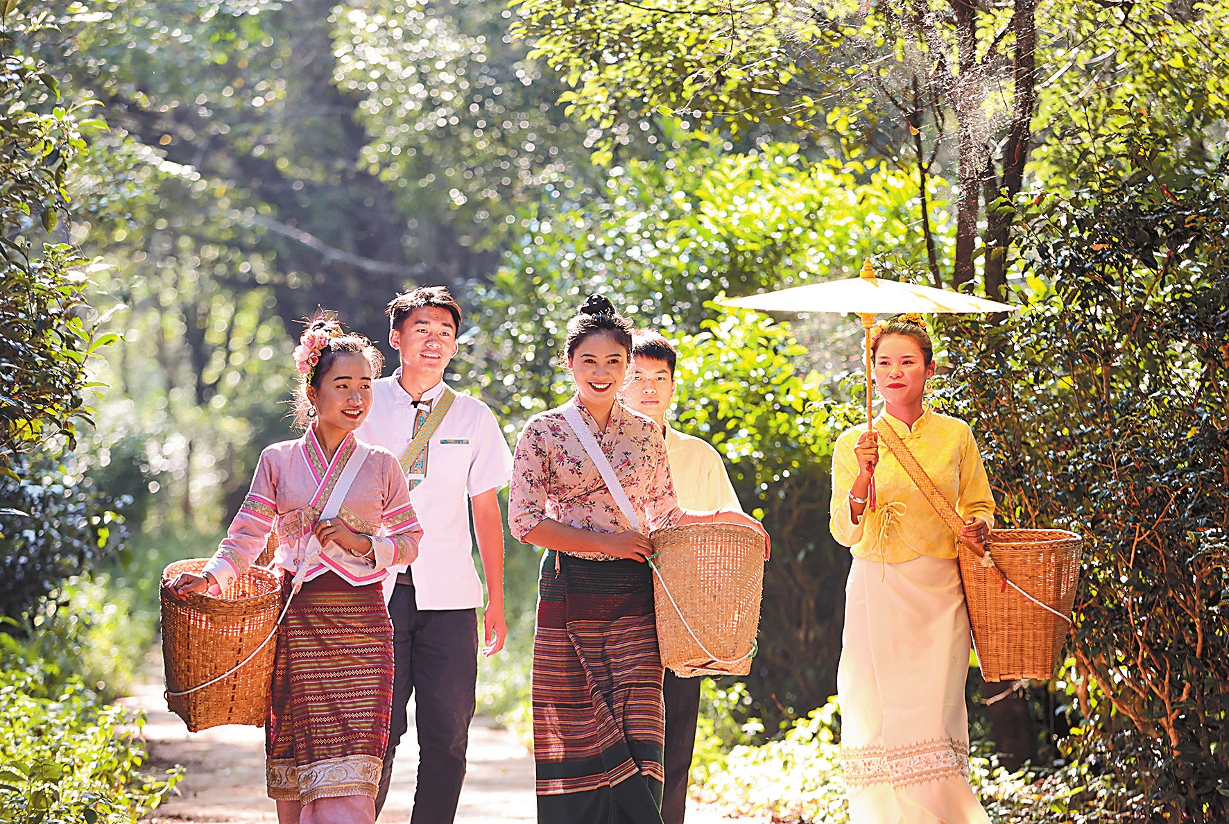 “你的裙子上粘满了草籽,没想到除了鲜花,景迈山还给了你其他馈赠。”午后,景迈山的寂静被一阵欢声笑语打破。芒景村“芒景古茶人家”客栈前,来自北京的张琪身着布朗族裙装,头戴手工发饰,与当地村民围坐在桌前一边说笑一边插花,身旁的背篓里是刚从山里摘下的带有雨水的野花。“我去过云南的许多地方,这次选择来景迈山就是想好好休息,放松一下。平时和村民们一起生活,采花、聊天,很开心。”张琪说。