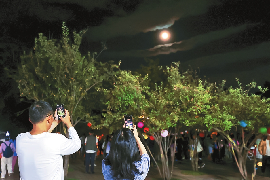 市民游客在昆明翠湖公园赏月。本报记者 胡妤雅 摄