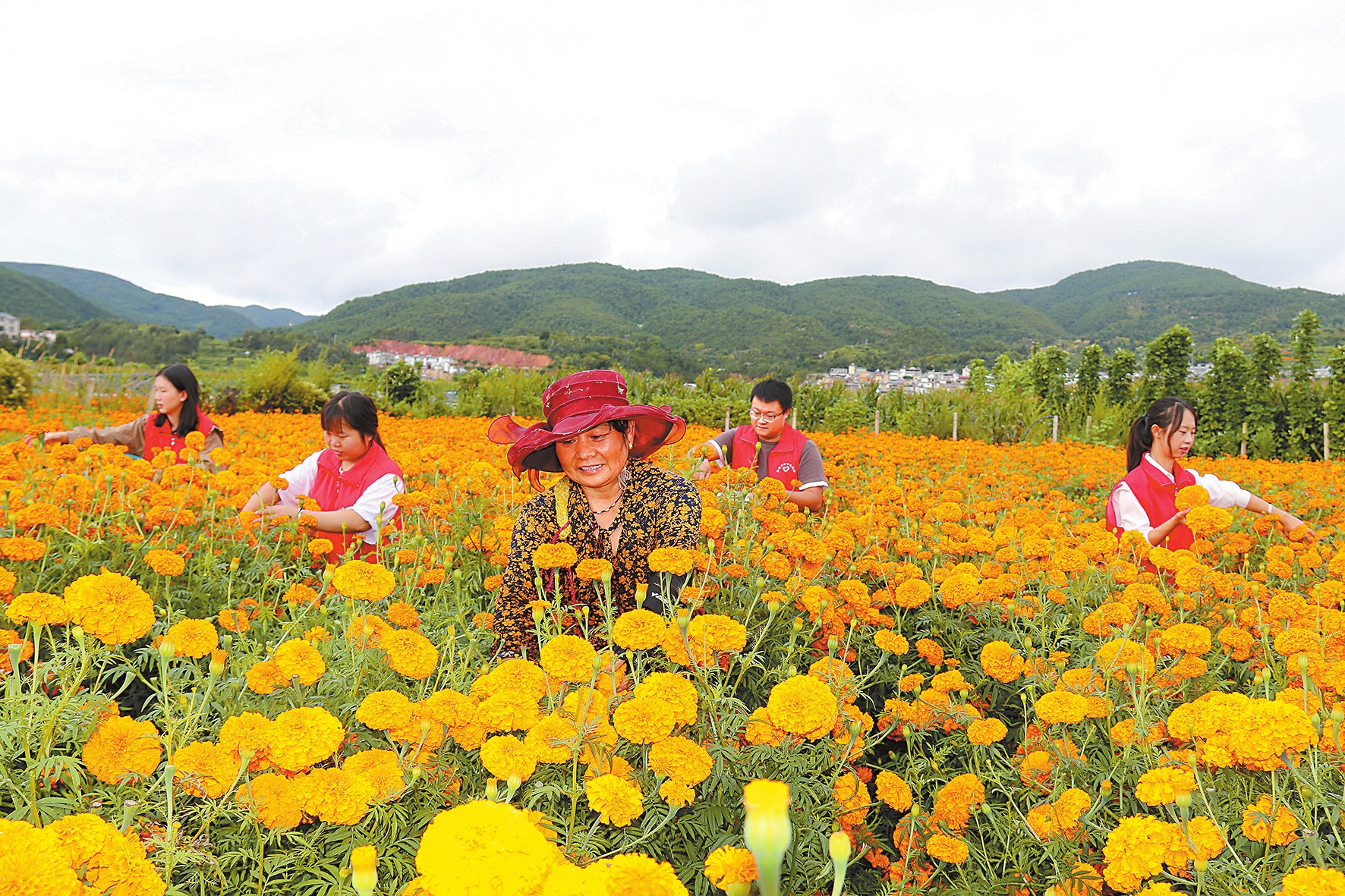 金秋时节,走进弥渡县密祉镇莲峰村,放眼望去,金灿灿的万寿菊竞相绽放,村民们在田垄间娴熟地采摘、装袋。