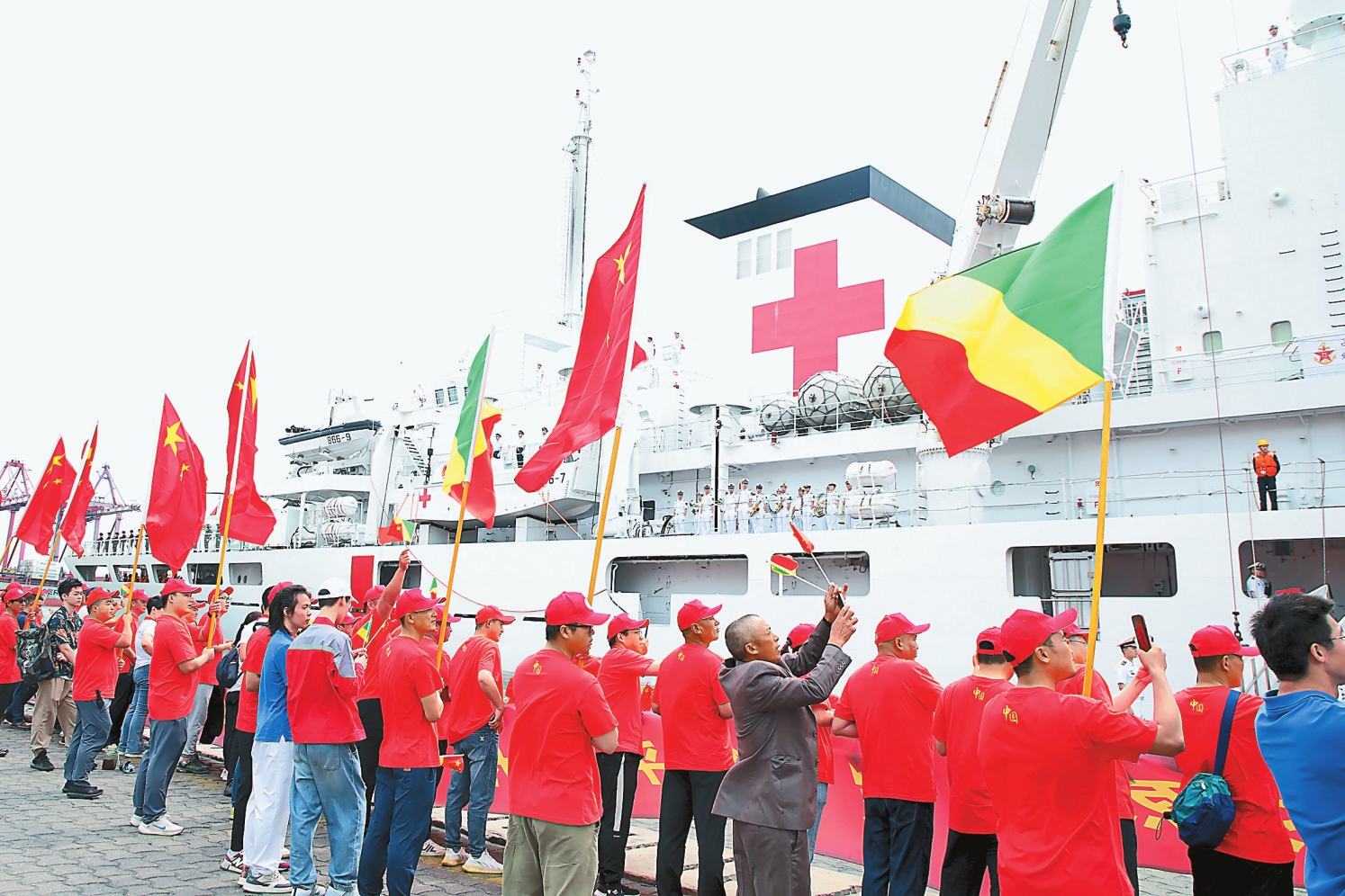 9月22日在刚果(布)黑角港拍摄的中国海军“和平方舟”号医院船欢送仪式现场。当地时间22日上午10时许,执行“和谐使命-2024”任务的中国海军“和平方舟”号医院船缓缓驶离刚果(布)黑角港码头,圆满完成对刚果(布)的再次访问。离开刚果(布)后,“和平方舟”号医院船将按计划前往此次任务的第八站加蓬。 新华社发 刘志磊 摄