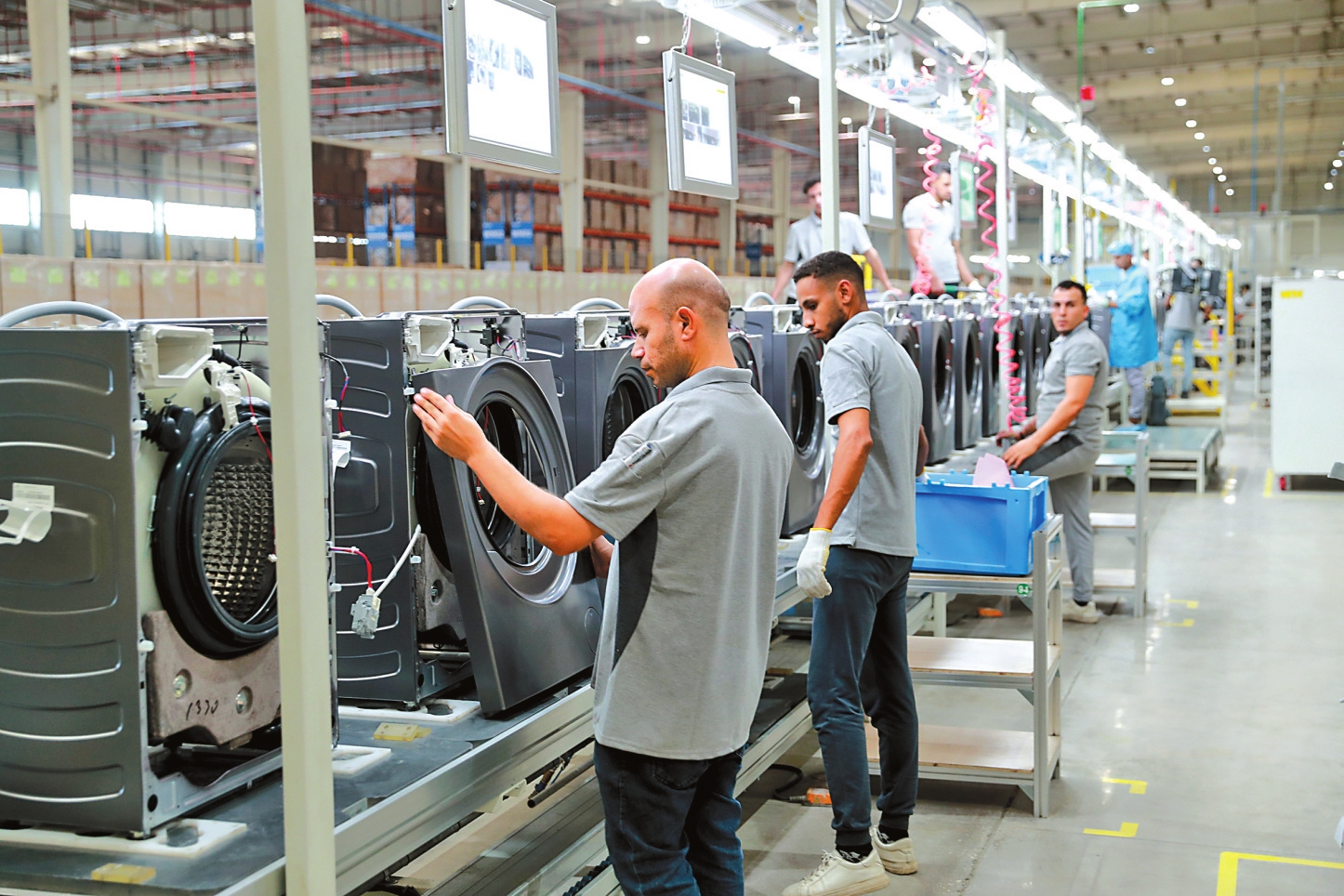 由中国企业海尔投资的海尔埃及生态园二期(制冷工厂)项目23日在埃及斋月十日城举行奠基仪式。海尔埃及生态园占地20万平方米。今年5月投产的一期项目主要覆盖空调、电视、洗衣机等产品;本次奠基的二期项目投资约4000万美元,生产冰箱、冷柜两大品类。图为9月23日,在埃及斋月十日城,工人在海尔埃及生态园一期项目的洗衣机生产线上工作。