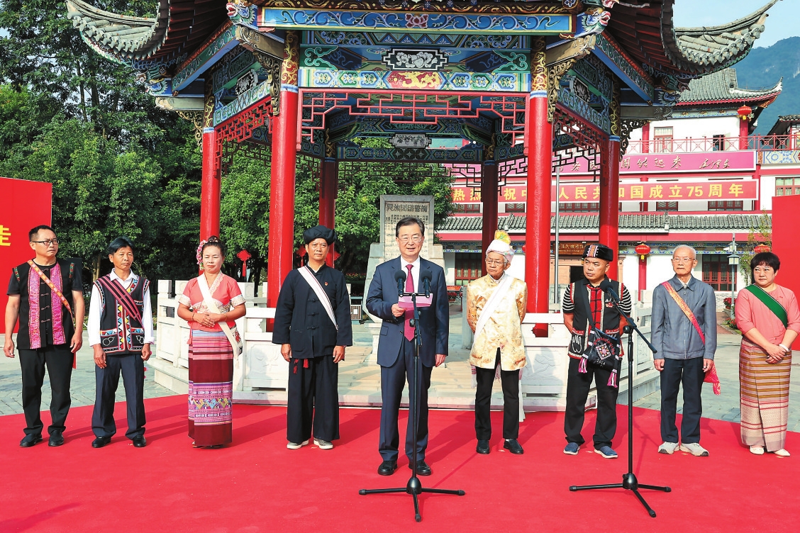 9月25日上午,省委书记王宁来到宁洱哈尼族彝族自治县,向民族团结誓词碑盟誓代表后代及广大干部群众宣读习近平总书记的回信。本报记者 雷桐苏 陈飞 胡妤雅 摄