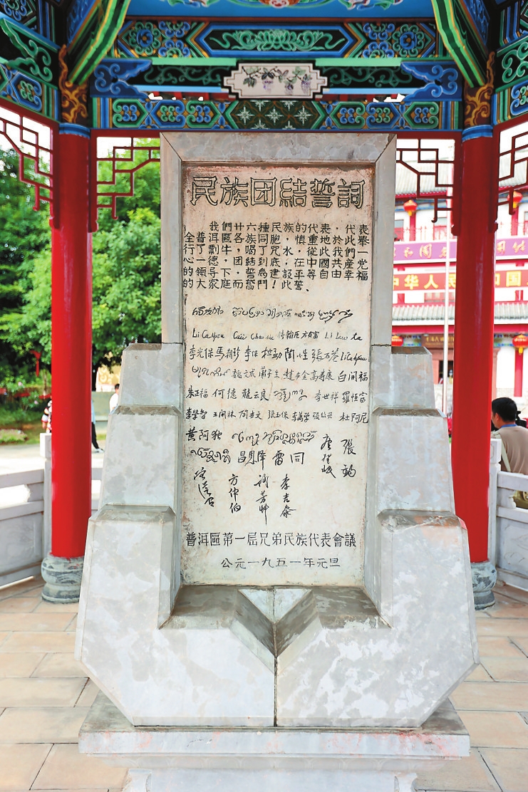 1951年1月1日,3000多名群众参加了在宁洱红场上举行的民族团结盟誓大会。按照佤族重大祭典的习俗,喝鸡血、剽牛,各族代表共48人在“民族团结誓词碑”上用汉文、傣文、拉祜文签上自己的名字。碑文写道:“我们廿六种民族的代表,代表全普洱区各族同胞,慎重地于此举行了剽牛,喝了咒水,从此我们一心一德,团结到底,在中国共产党的领导下,誓为建设平等自由幸福的大家庭而奋斗!此誓!”这块民族团结誓词碑被誉为“新中国民族团结第一碑”。