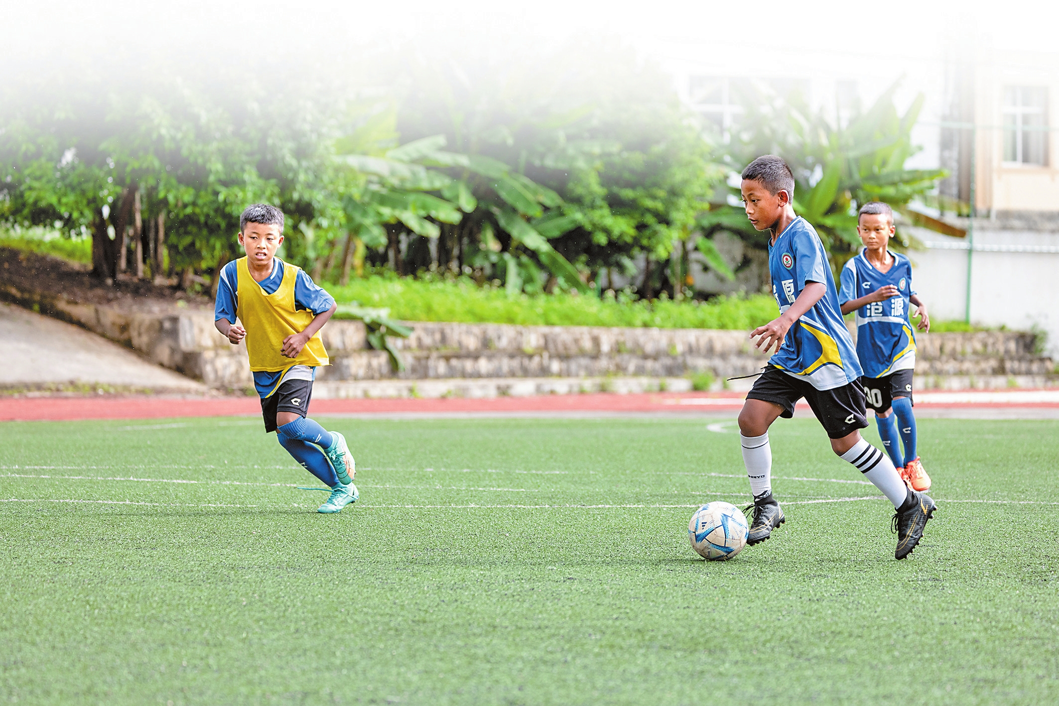 传球、接球、运球、带球……即使在假期,位于沧源县城南部的勐董镇中心完小也格外热闹。足球少年们在绿茵场上自由奔跑,身上蓝白相间的球服与蓝天白云遥相呼应,球服胸前印着的“沧源”两个大字格外显眼。