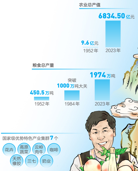 在云南,粮食生产由长期短缺到总量基本平衡,肉类生产从不能自给自足到自给有余并大量外调,人民群众实现从饥饿到吃饱再到吃好的转变……一个又一个成就的背后,是一代又一代人砥砺前行的结果。
