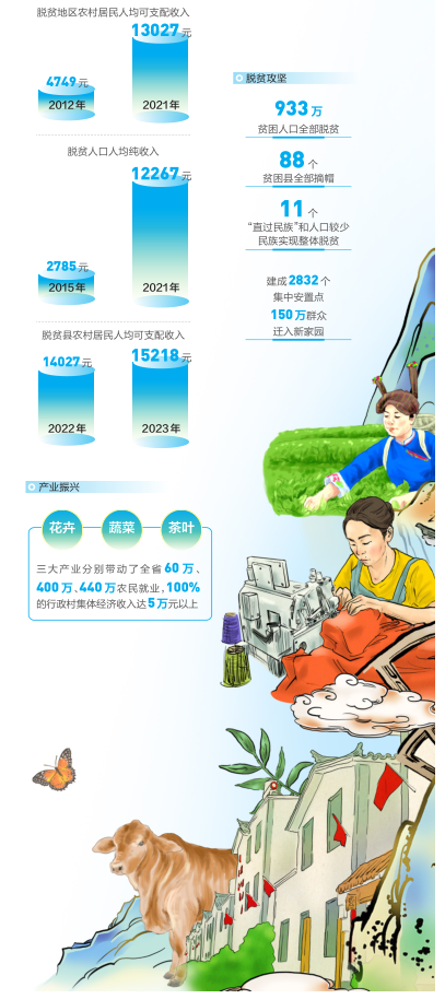 全省933万农村贫困人口全部脱贫,消除了绝对贫困。88个贫困县全部摘帽,8502个贫困村全部出列,解决了区域性整体贫困问题。11个“直过民族”和人口较少民族整体脱贫,继从原始社会到社会主义社会的“千年跨越”后,实现了从贫穷落后到全面小康的第二次“跨越”,贫困地区经济社会面貌发生巨大变化。全省8502个贫困村实现100%通硬化路、通动力电、光纤网络全覆盖。贫困群众出行难、喝水难、用电难、通讯难、上学难、就医难、住房难等问题得到普遍解决。边疆民族地区经济发展滞后、思想观念落后的状况发生了深刻改变;各族群众的获得感、幸福感、安全感显著增强。2020年已脱贫群众人均纯收入达到10721元,实现了从解决温饱、到总体小康、再到全面小康的历史性跨越。