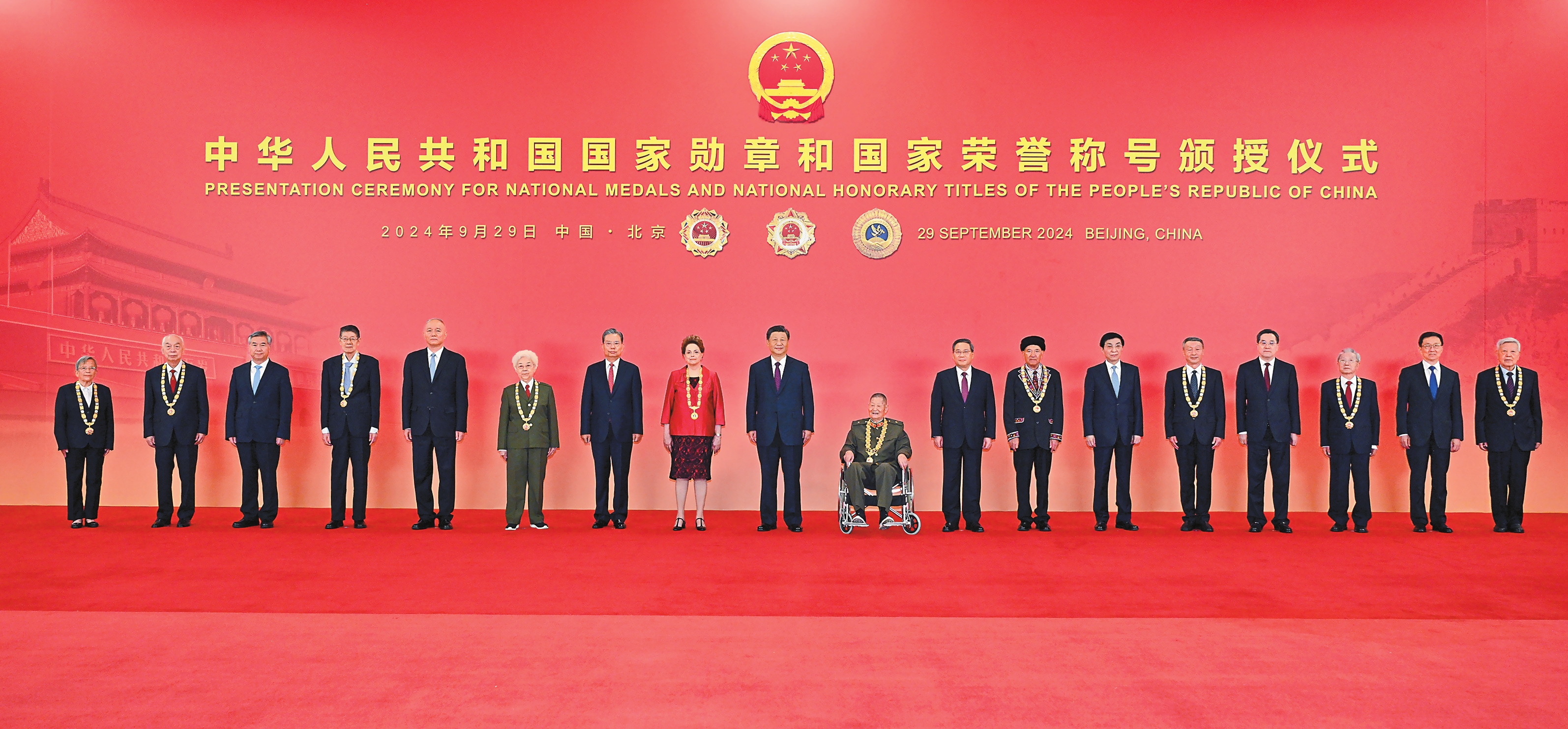 蔡奇宣读习近平签署的中华人民共和国主席令。主席令指出,为了庆祝中华人民共和国成立75周年,隆重表彰为新中国建设和发展作出杰出贡献的功勋模范人物,弘扬民族精神和时代精神,根据第十四届全国人民代表大会常务委员会第十一次会议的决定,授予王永志等4人“共和国勋章”,授予迪尔玛·罗塞芙“友谊勋章”,授予王小谟等10人国家荣誉称号。