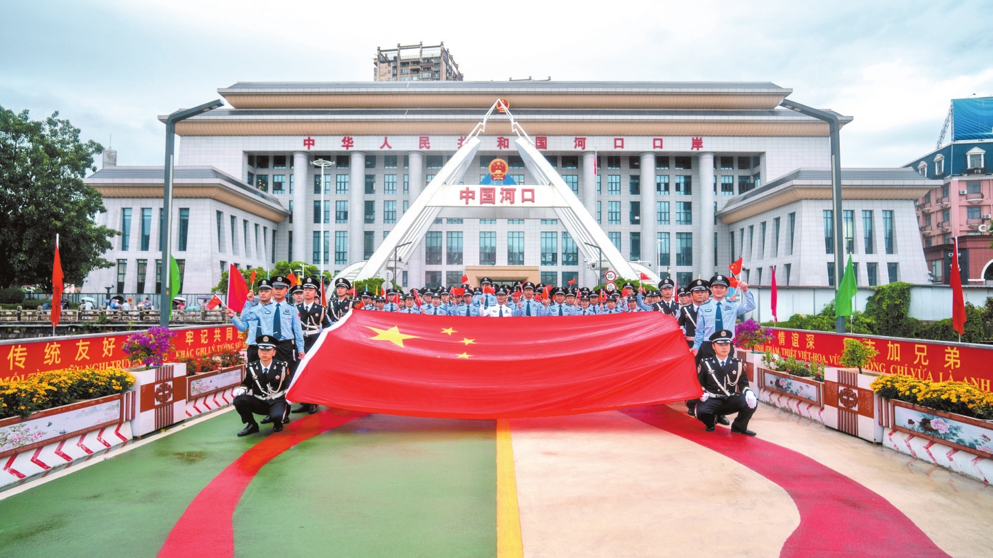 10月1日,红河哈尼族彝族自治州河口瑶族自治县在河口口岸举行“千里边疆同升国旗同唱国歌”活动,热烈庆祝中华人民共和国成立75周年。7时30分,雄浑激昂的国歌声响彻云霄,旗手奋力将国旗高高扬起,鲜艳的五星红旗在晨光中冉冉升起。升旗仪式激发了边疆干部群众的爱国热情,激励他们以更加饱满的精神、昂扬的姿态投入工作和生活中。