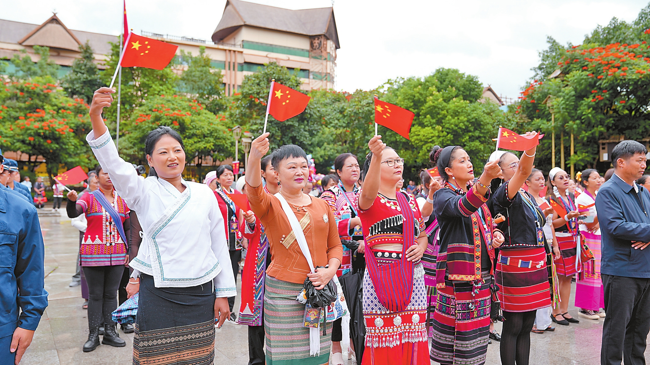 10月1日一大早,腾冲市司莫拉佤族村广场上晨雾还未散去,当地村民、镇村干部以及来自四面八方的游客早早排好队列,等待着参加“千里边疆同升国旗同唱国歌”活动。上午9时,随着激昂的《义勇军进行曲》响起,全场肃立,人们凝视着缓缓升起的五星红旗,高唱国歌,表达对祖国的深深热爱和祝福。