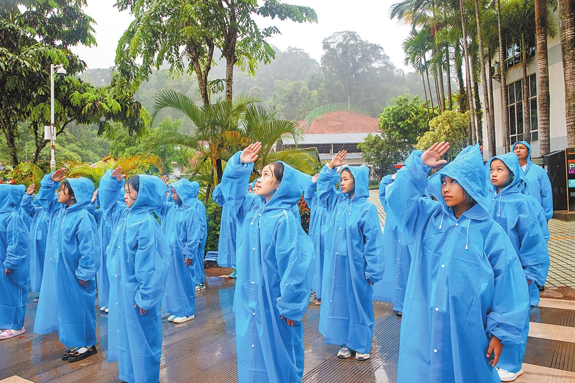 10月1日的磨憨镇,处处鲜花盛开、红旗飘扬。8时30分,磨憨—磨丁合作区在磨憨公路口岸举行庆祝中华人民共和国成立75周年升旗仪式。冒着蒙蒙细雨,现场参加升旗仪式的400余人整齐列队。国旗护卫队迈着铿锵有力的步伐,护卫着国旗走向升旗台。伴随着雄壮的国歌声,鲜艳的五星红旗冉冉升起。现场全体人员肃立致敬,表达对伟大祖国的崇高敬意和衷心祝福。