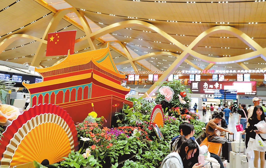 昆明长水国际机场航站楼大厅内布置了国庆花坛景观。