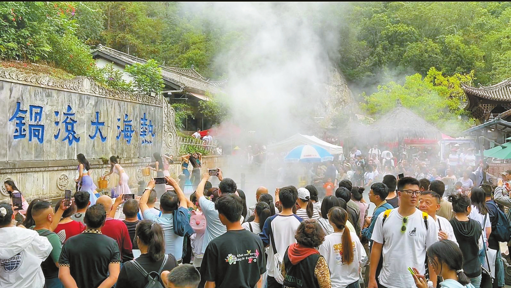 腾冲热海景区推出大滚锅快闪活动,演员们在热气升腾的大滚锅旁演绎灵动的仙子,轻盈曼妙的身姿与热海的热气相得益彰,游客们纷纷拿出手机记录这美丽的瞬间。第一次来腾冲的湖南游客唐宋感慨:“刚刚的大滚锅快闪表演加上蒸气,仙气飘飘,令人仿佛置身仙境,很漂亮很美。”