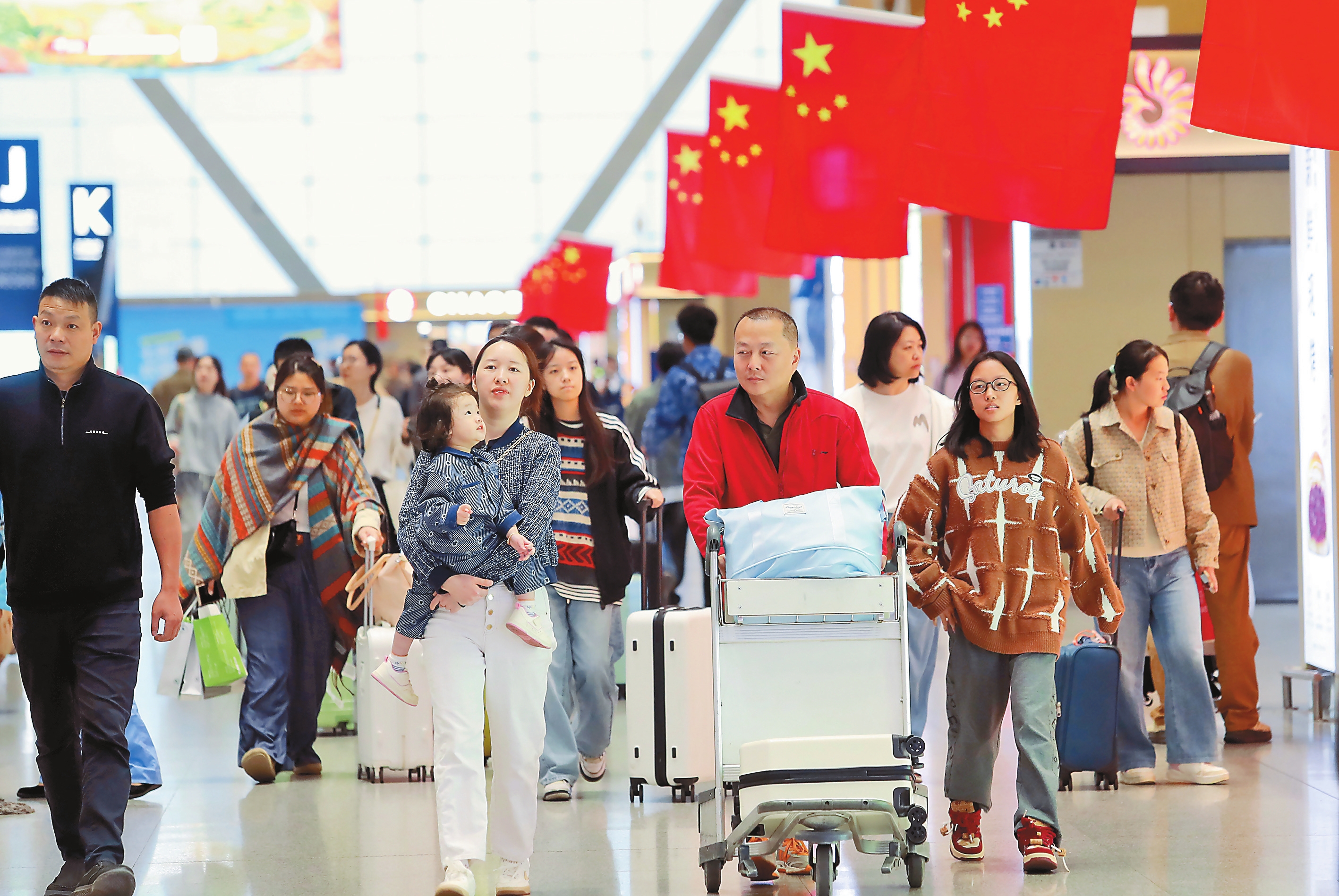10月7日,昆明长水国际机场迎来返程客流高峰,候机大厅内熙熙攘攘,热闹非常。当天,昆明长水国际机场航班计划进港515架次、出港513架次,共计1028架次,为国庆假期进出港航班架次最高峰。10月1日至6日,昆明长水国际机场进出港航班5731架次、旅客吞吐量853398人次,日均旅客吞吐量超过14万人次。本报记者 杨峥 摄