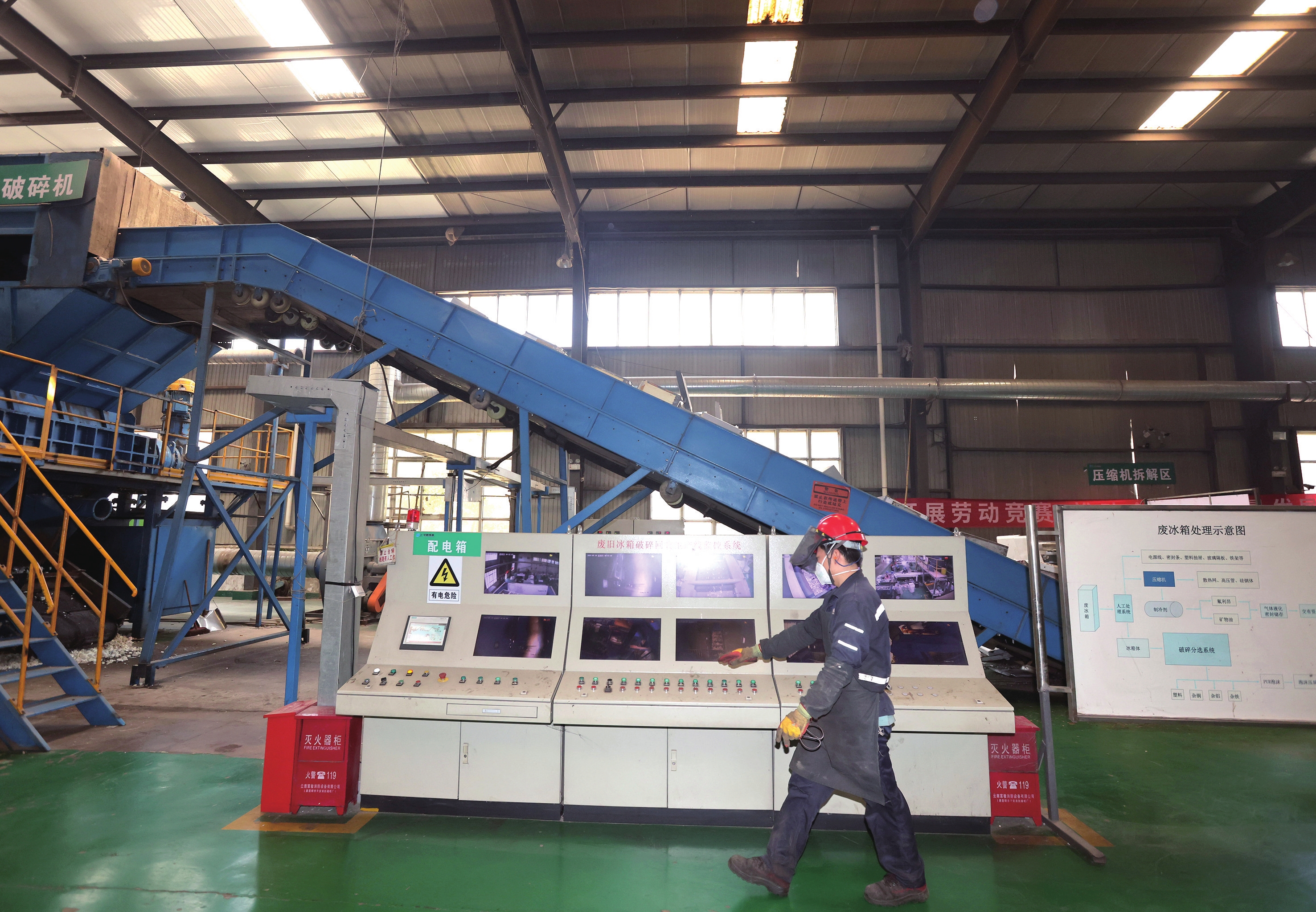 在华再环保拆解车间里,“四机一脑”等5条拆解处理线有序排列,集破碎、分选于一体的处理设备高效运行。一台废旧冰箱进入处理线后,先回收其中对大气层有破坏的氟利昂,再对产生废油的压缩机进行打孔收集,随后进行箱体破碎处理。