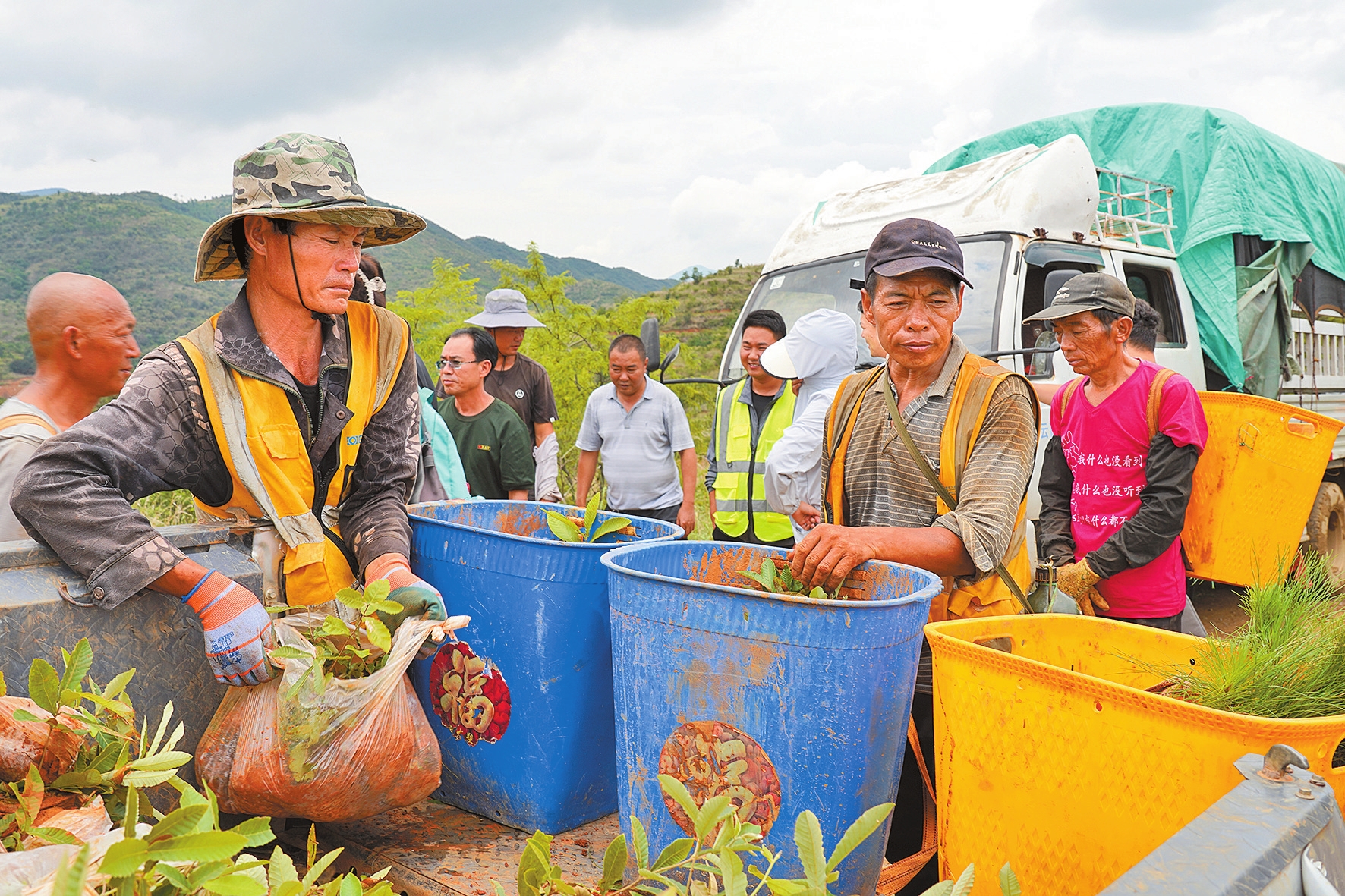 晨雨过后,百余名工人来到位于大理白族自治州宾川县金牛镇金甸村委会的国有林场,挖坑植树,开展人工造林,为自然添绿。