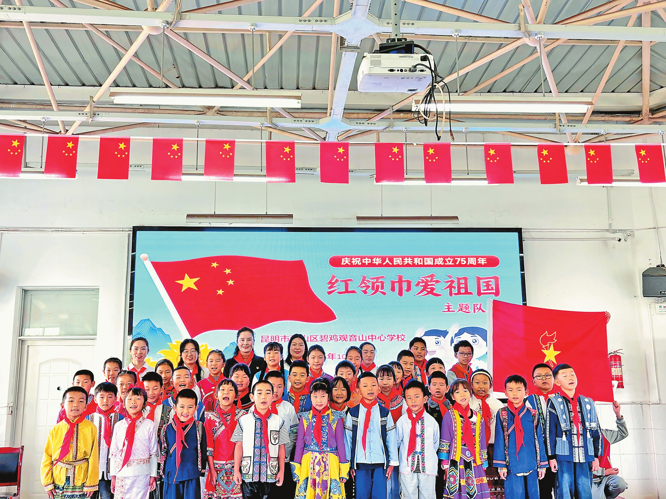 10月13日是中国少年先锋队建队75周年纪念日。连日来,我省各地学校开展丰富多彩的“红领巾爱祖国”主题活动,同学们学习历史、重温红色故事、感受时代发展,一批新队员戴上鲜艳的红领巾在建队纪念日光荣地加入少先队。图为昆明市观音山中心学校开展建队日主题活动。本报记者 党晓培 王琼梅 摄
